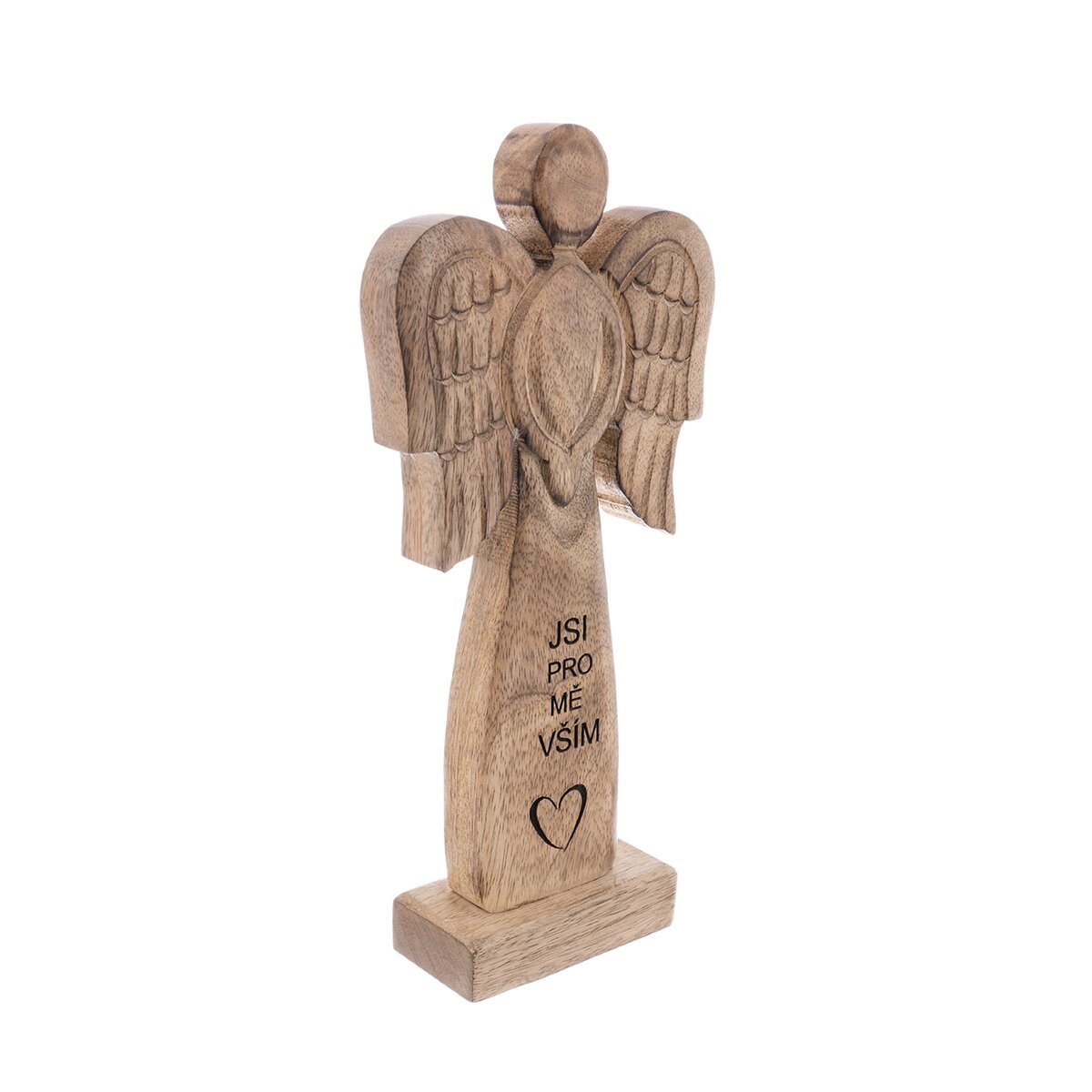 Kód produktu 351893Anjel z prírodného mangového dreva vnesie do vášho domova pokoj, harmóniu a dotyk jemnej elegancie. Táto nádherná dekorácia očarí svojim jednoduchým, ale zároveň silne pôsobivým designom, ktorý podčiarkuje prirodzená kresba dreva. Každý anjel je originál – vďaka ručnému spracovaniu a prírodnému materiálu. Na prednej strane anjela je nápis „Si pre mňa všetkým“, ktorý dodáva dekorácii hlboký osobný význam. Tento anjel je nielen krásnym doplnkom interiéru, ale aj ideálnym darčekom pre niekoho, na kom vám záleží. Materiál: mangové drevo. Rozmery: š. 13,5 cm, v. 30 cm.