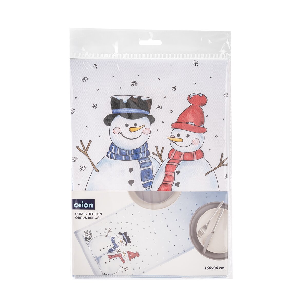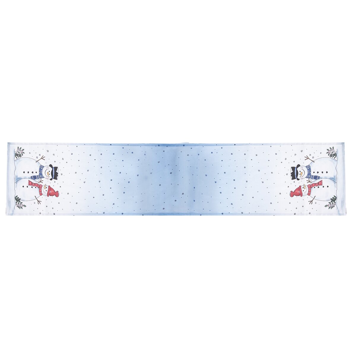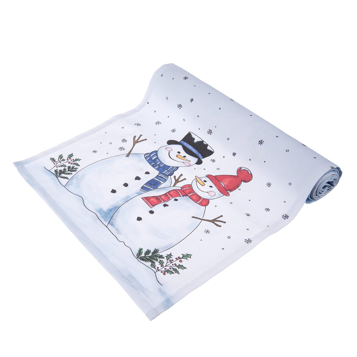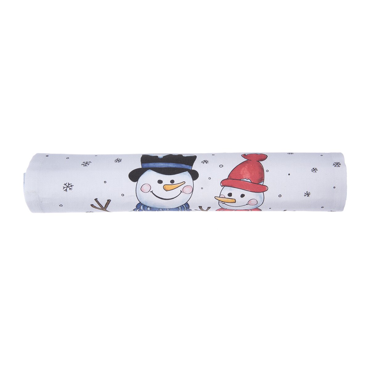 Kód produktu 728093Svetlý behúň s motívom snehuliaka a poletujúcich snehových vločiek je vyrobený zo 100% bavlny a ozdobí stôl v kuchyni, jedálni i obývacej izbe v zimnom období, v čase Adventu a Vianoc.