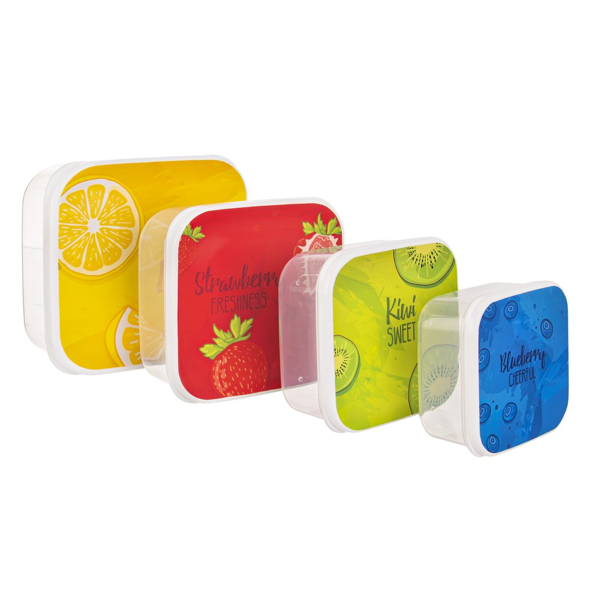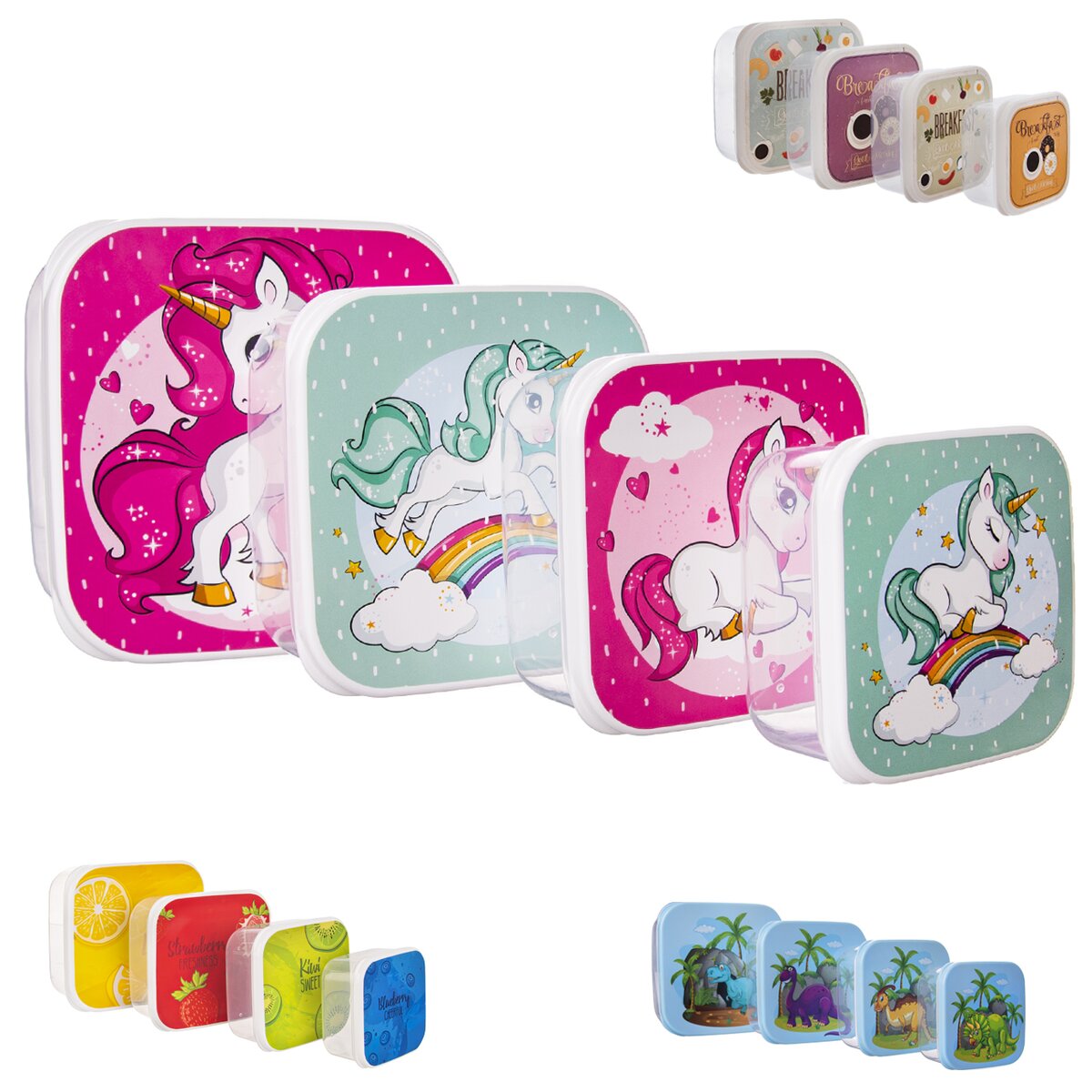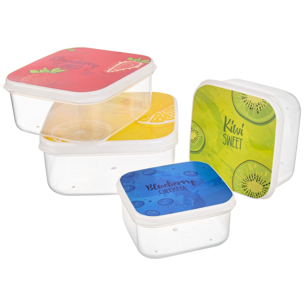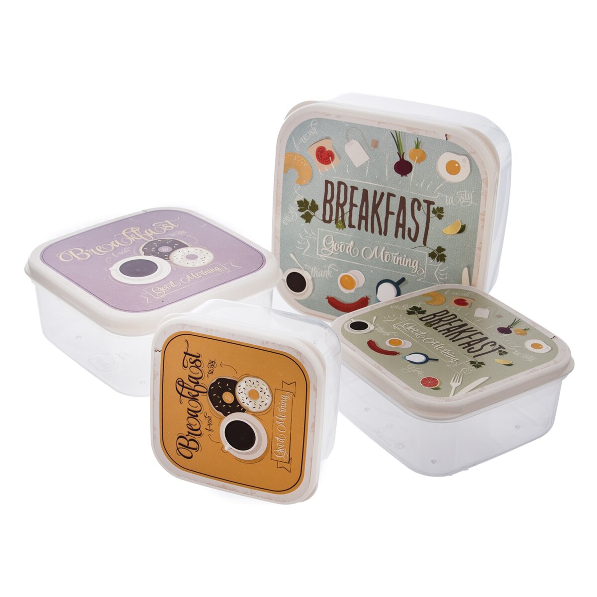 Sada boxov na desiatu s viečkom. Obsahuje 4 rôzne veľkosti boxov s vekom s farebným dekorom. Materiál: kvalitný plast. Použitie max. 95 °C. Vhodné do umývačky riadu i do MVR - bez viečka. Rozmery: objem 0,3 l, 9x9x4,5 cm/0,45 l, 10,5x10,5x5 cm/0,65 l, 12x12x5,5 cm a 1 l, 14x14x6 cm.