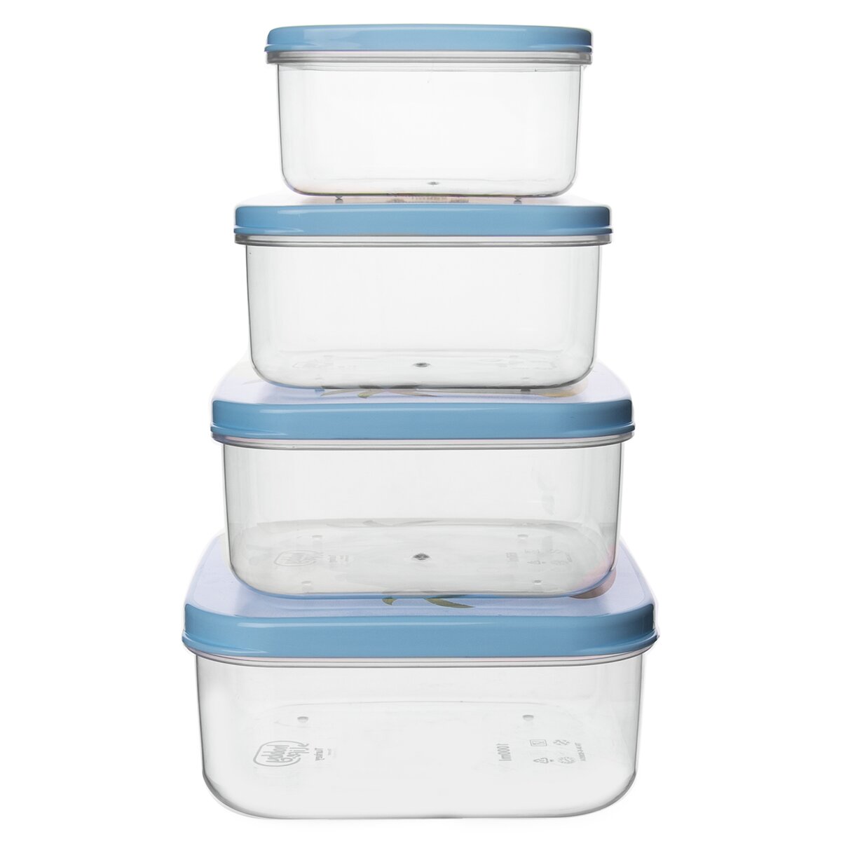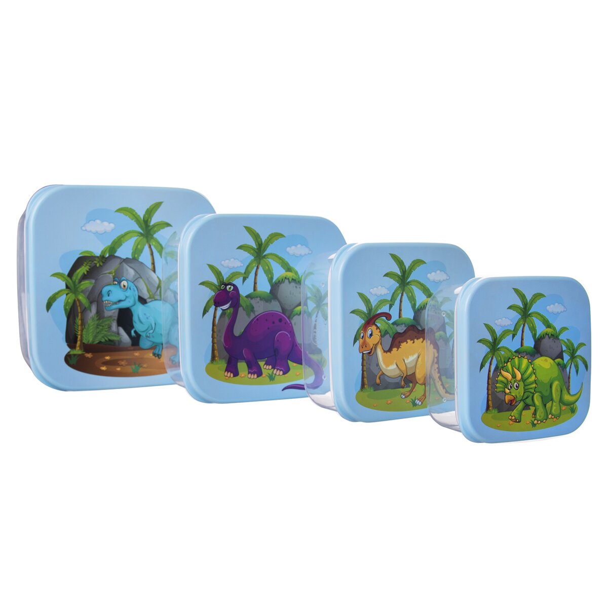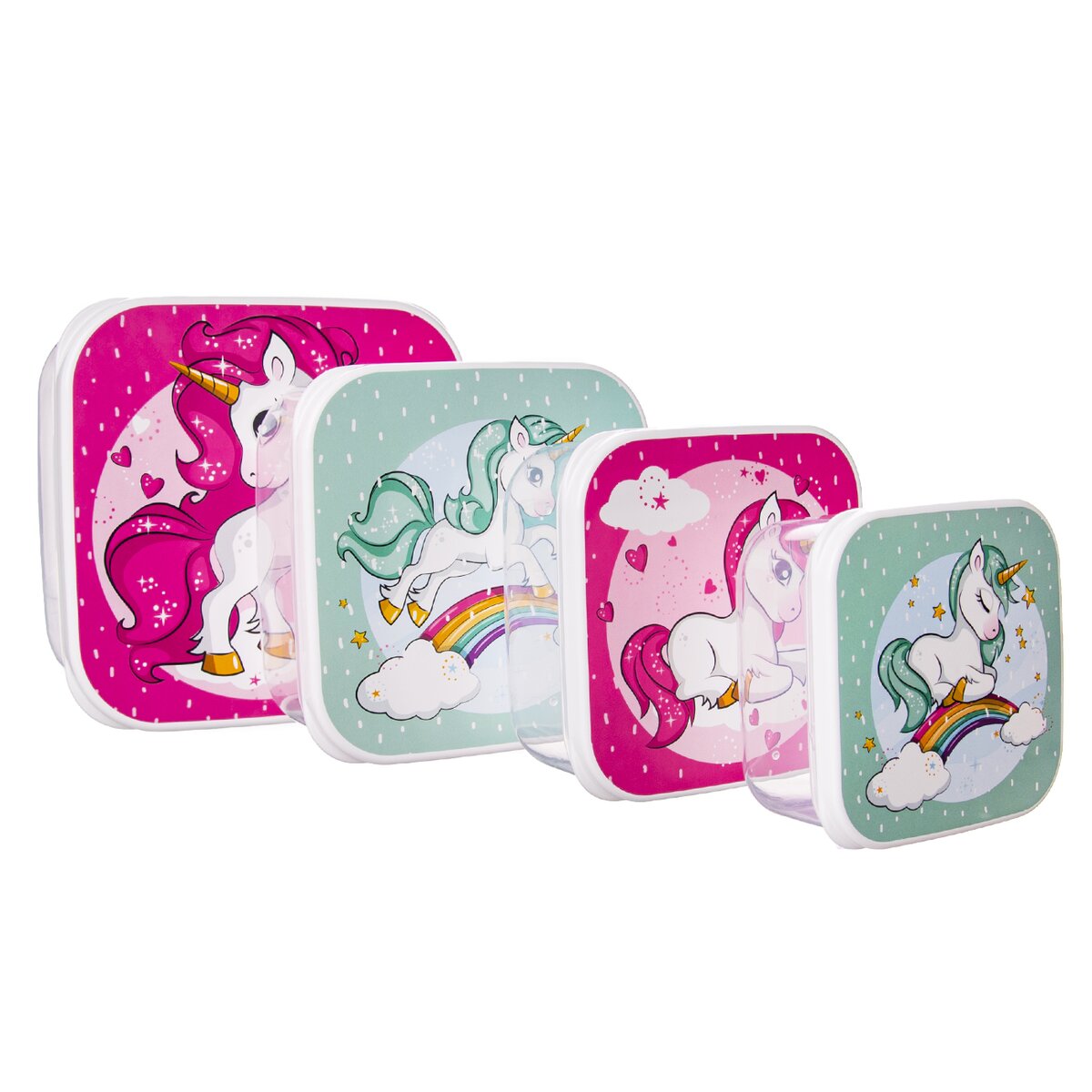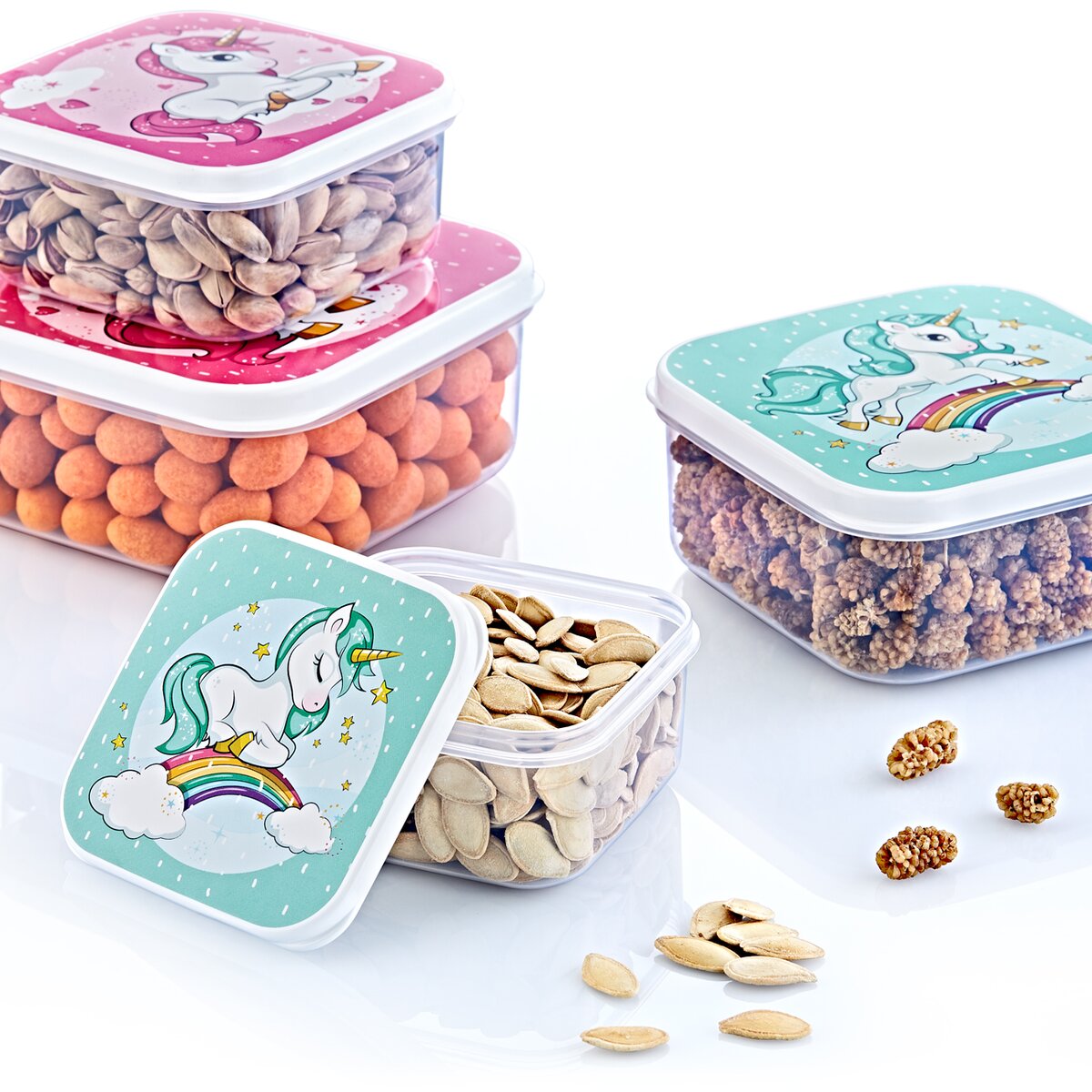 Sada boxov na desiatu s viečkom. Obsahuje 4 rôzne veľkosti boxov s vekom s farebným dekorom. Materiál: kvalitný plast. Použitie max. 95 °C. Vhodné do umývačky riadu i do MVR - bez viečka. Rozmery: objem 0,3 l, 9x9x4,5 cm/0,45 l, 10,5x10,5x5 cm/0,65 l, 12x12x5,5 cm a 1 l, 14x14x6 cm.