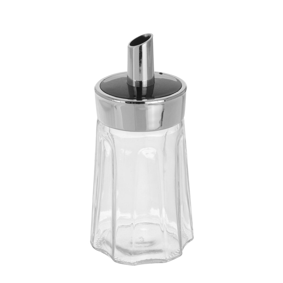 Cukornička s dávkovačom. Materiál: sklo, plast. Rozmery: pr. 7 cm, v. 14 cm.