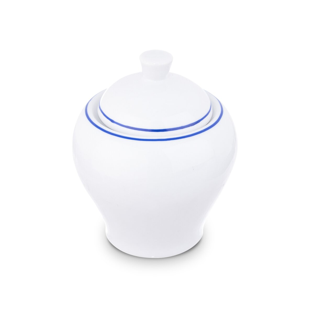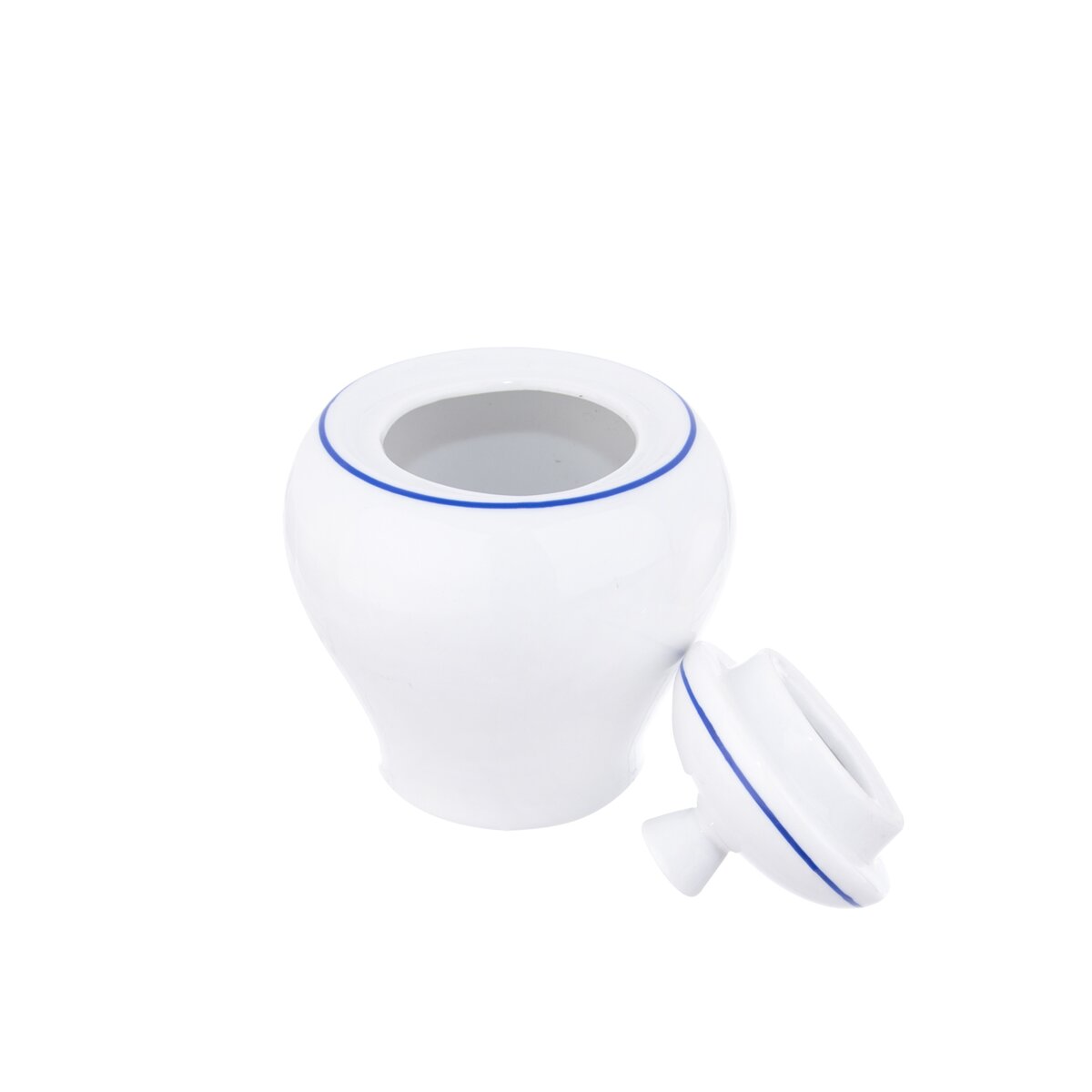 Kód produktu 126710Cukornička s modrou linkou. Materiál: porcelán. Rozmery: 0,3 l, pr. 8 cm, v. 11 cm.