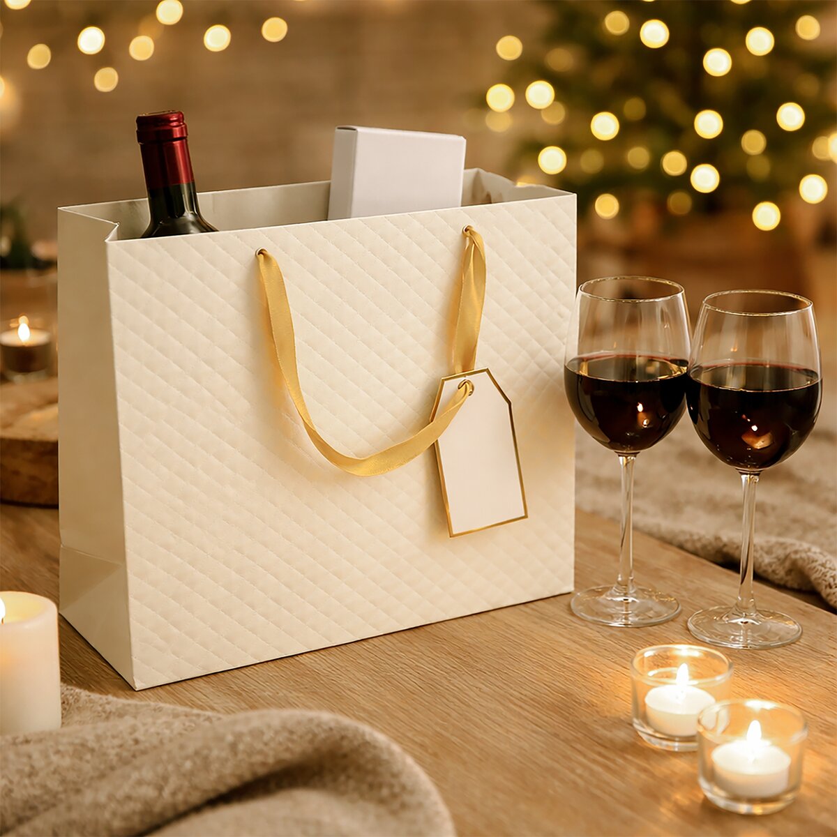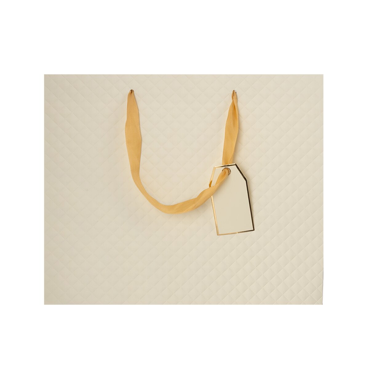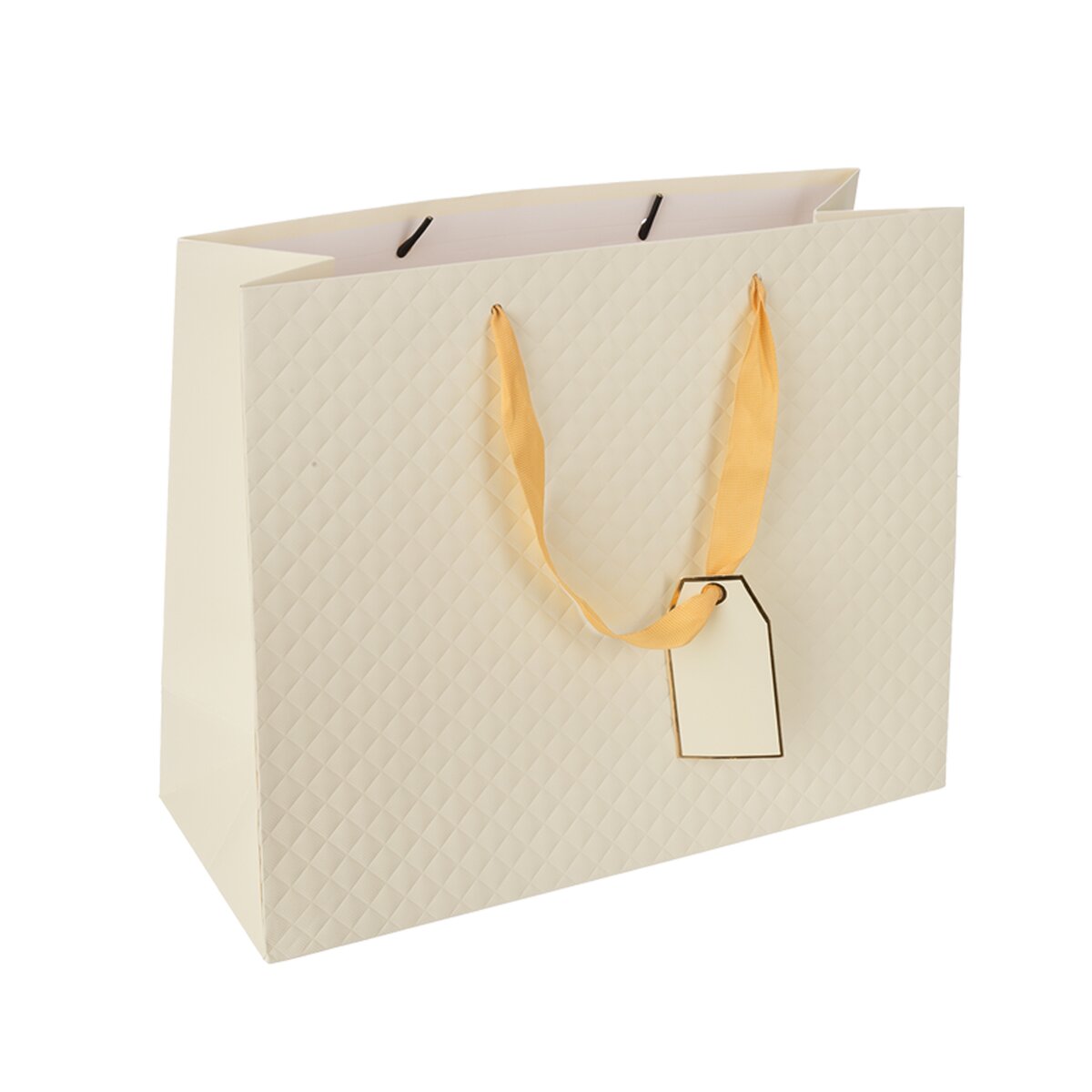 Kód produktu 823114Elegantná darčeková taška s dvoma uchami zo zlatej stuhy, plastickým dekorom mriežky z oboch strán, doplnená praktickou menovkou. Béžová. Materiál: papier, stužka - polyester. Rozmery: 31x12x26 cm.