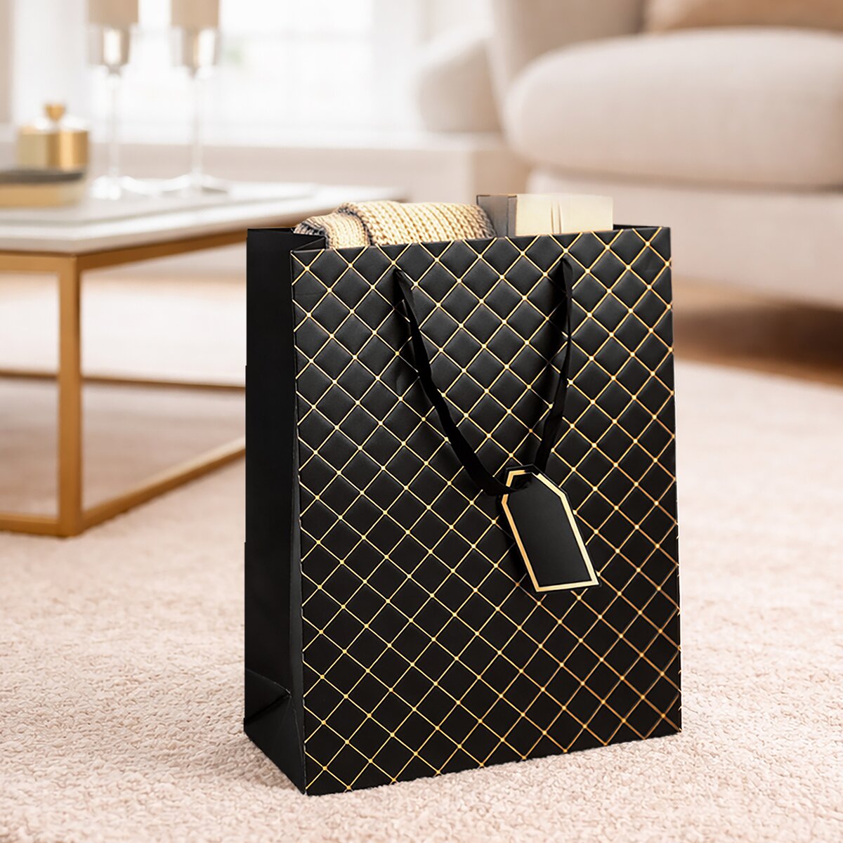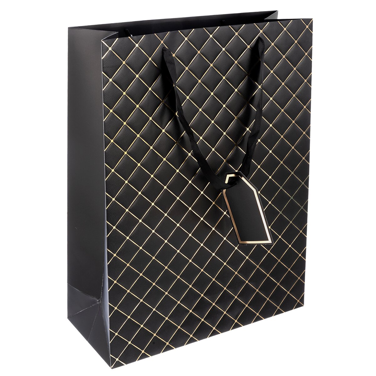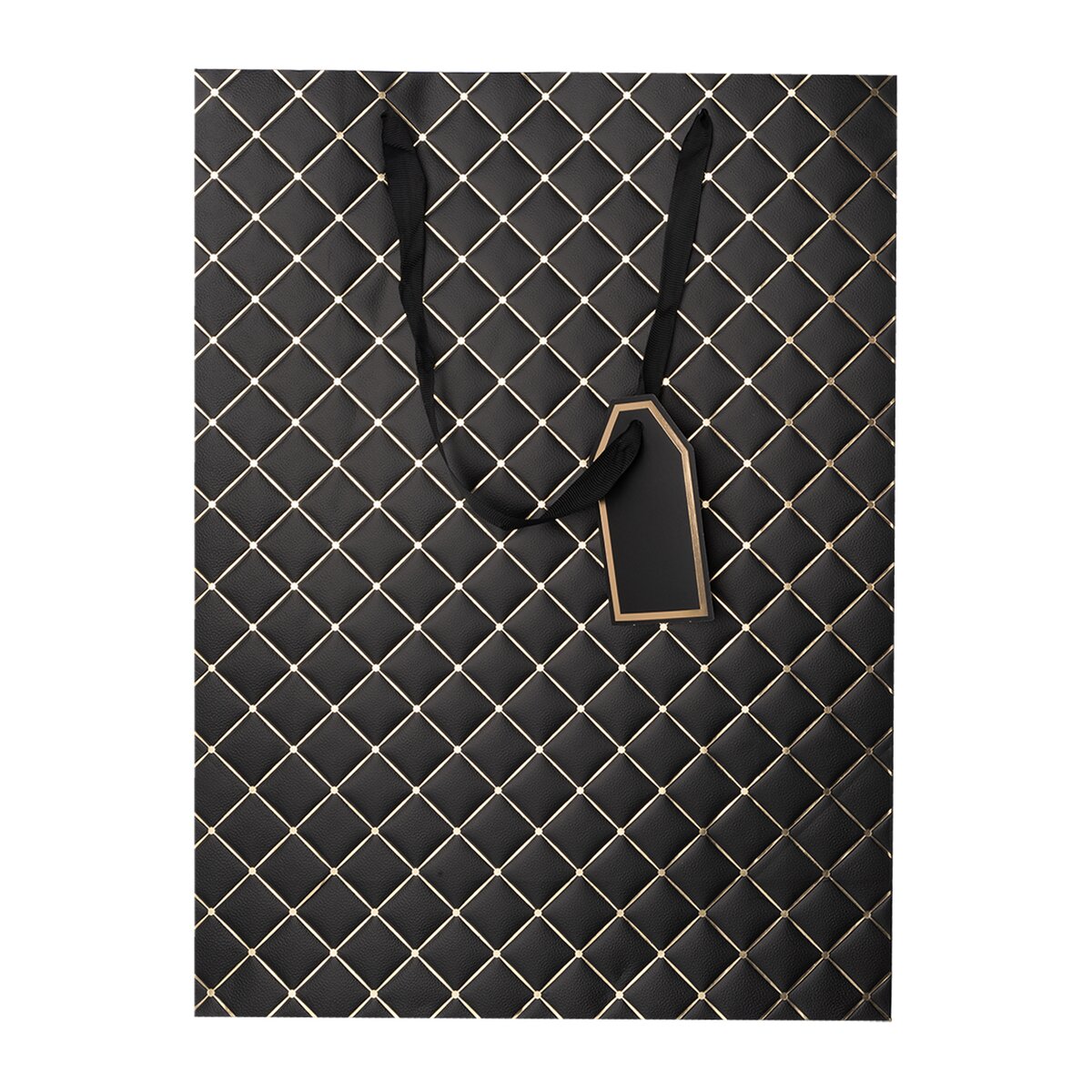Kód produktu 823120Elegantná darčeková taška s dvoma uchami z čiernej stuhy, plastickým dekorom mriežky z oboch strán, zvýraznená zlatou linkou na prednej strane, doplnená praktickou menovkou. Čierna. Materiál: papier, stužka - polyester. Rozmery: 31x12x42 cm.