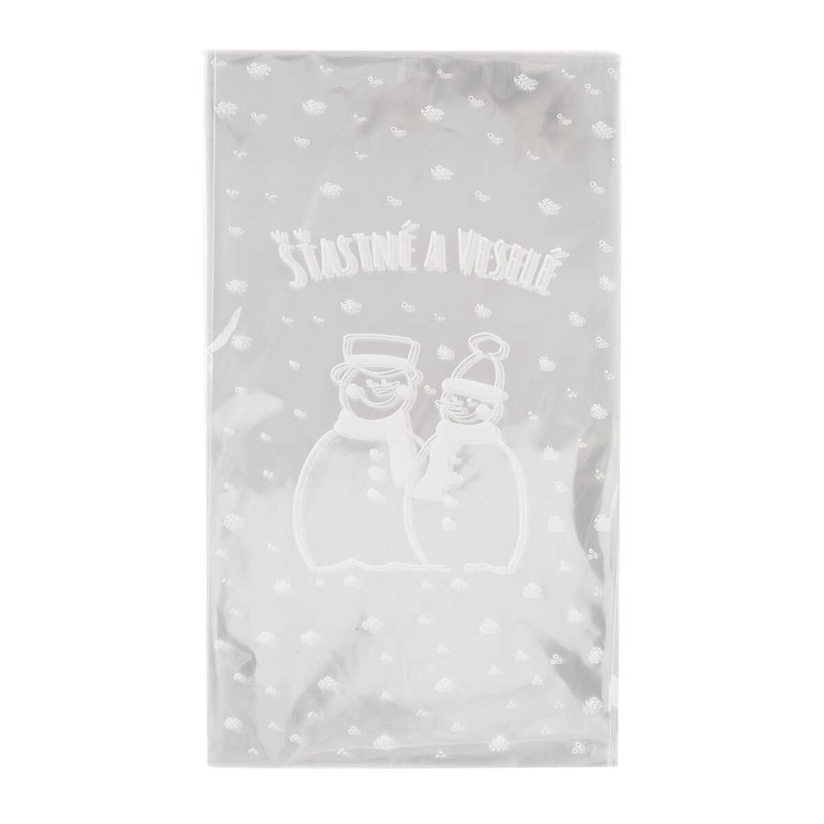 Toto originálne vrecko je priehľadné s decentnou bielou potlačou z prednej strany. Dizajn snehuliaka, poletujúcich vločiek a nápis "Šťastné a veselé" vznikol v dielni našich dizajnérov.
