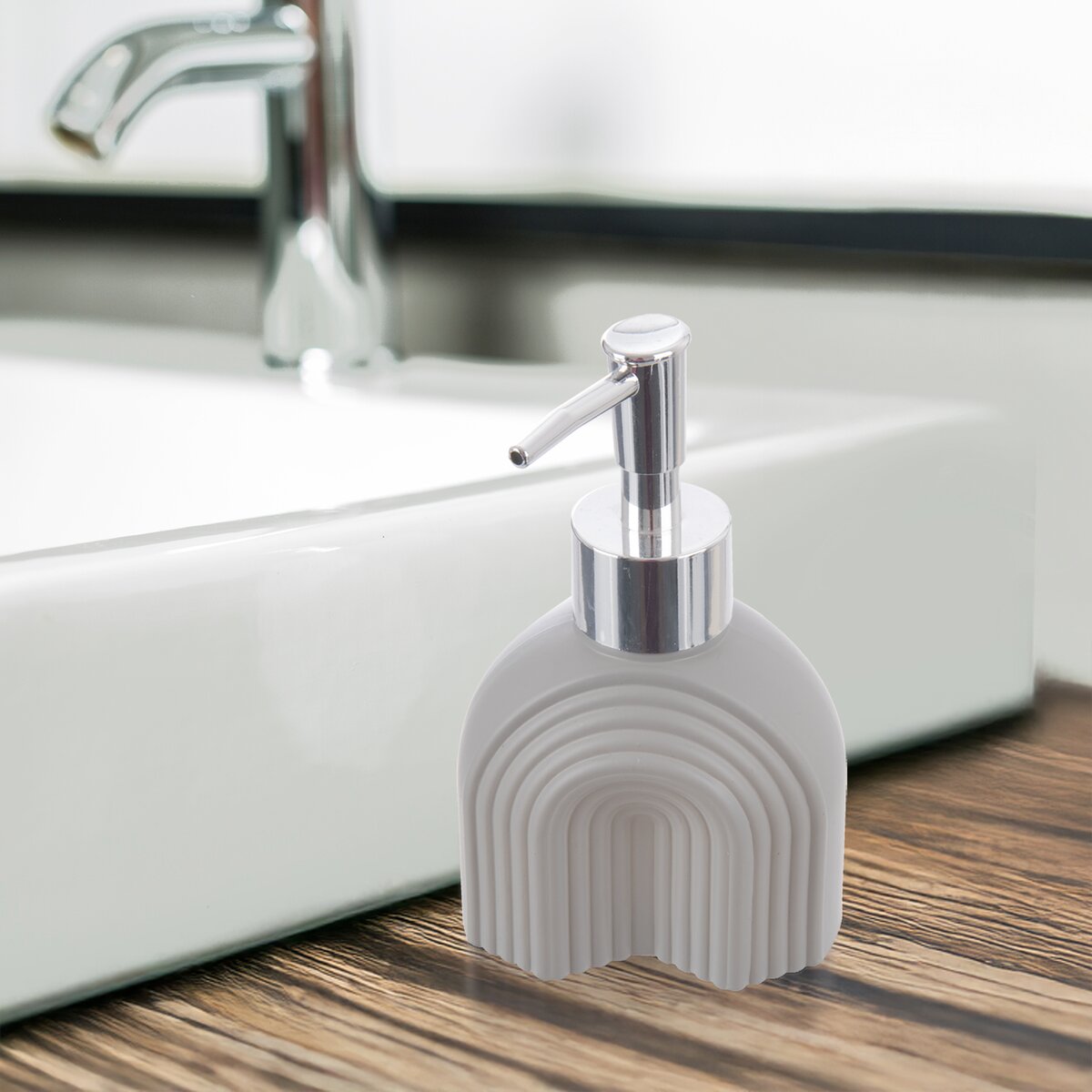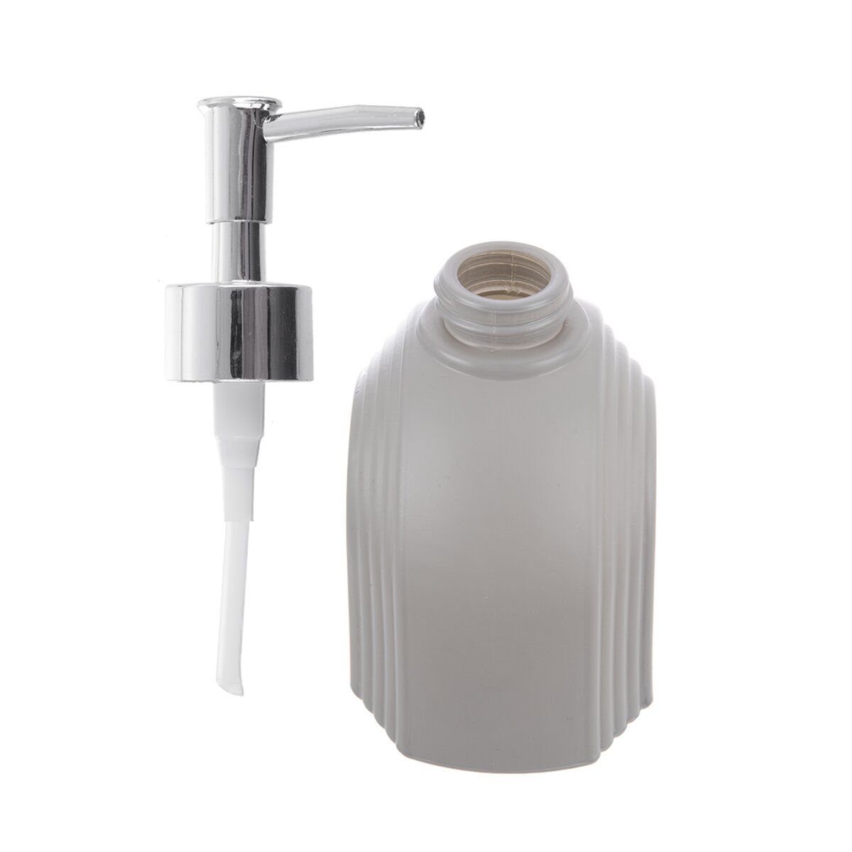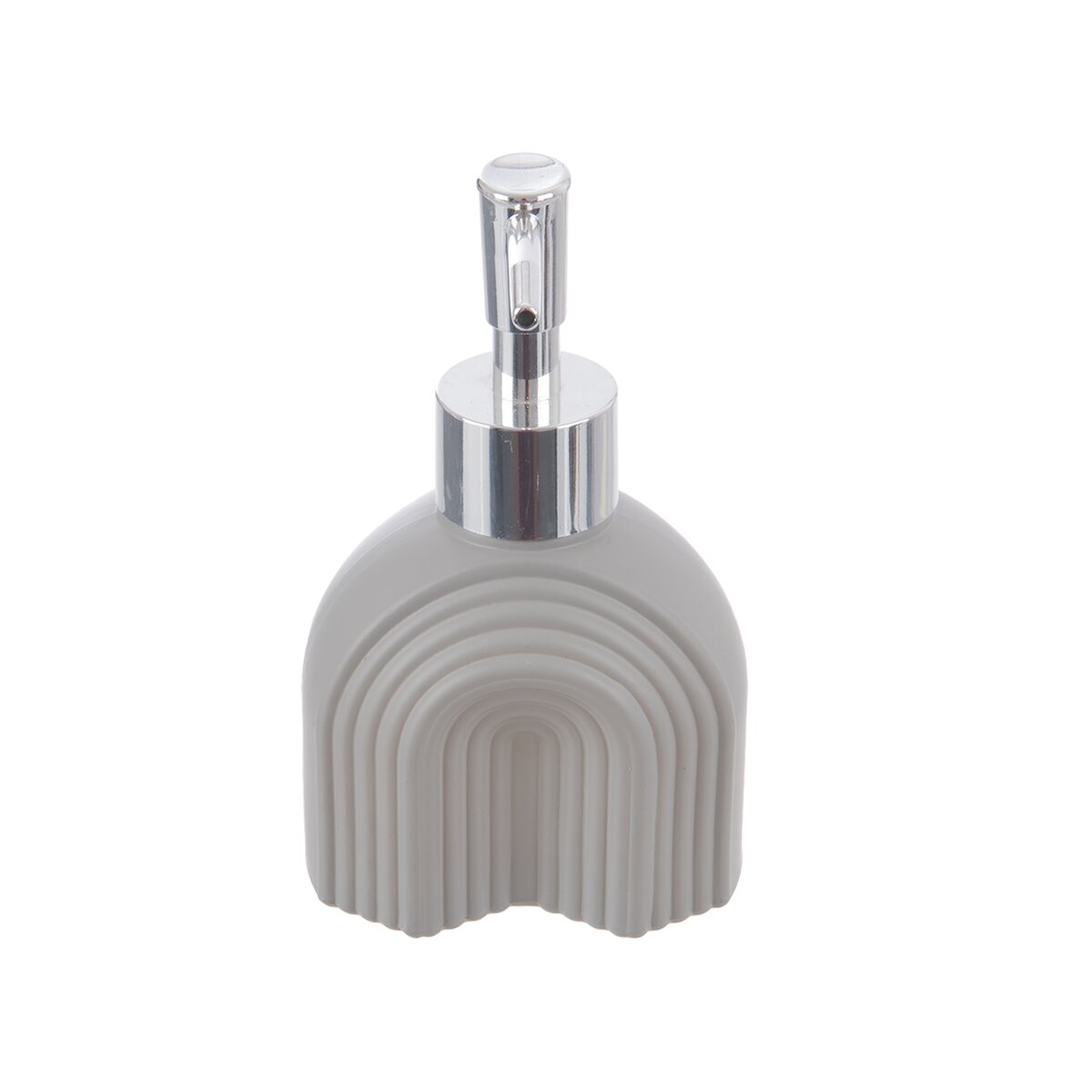 Kód produktu 530793Sklenený dávkovač mydla alebo saponátu s objemom 0,18 l je zdobený zaujímavým reliéfom a má šedý nástrek.