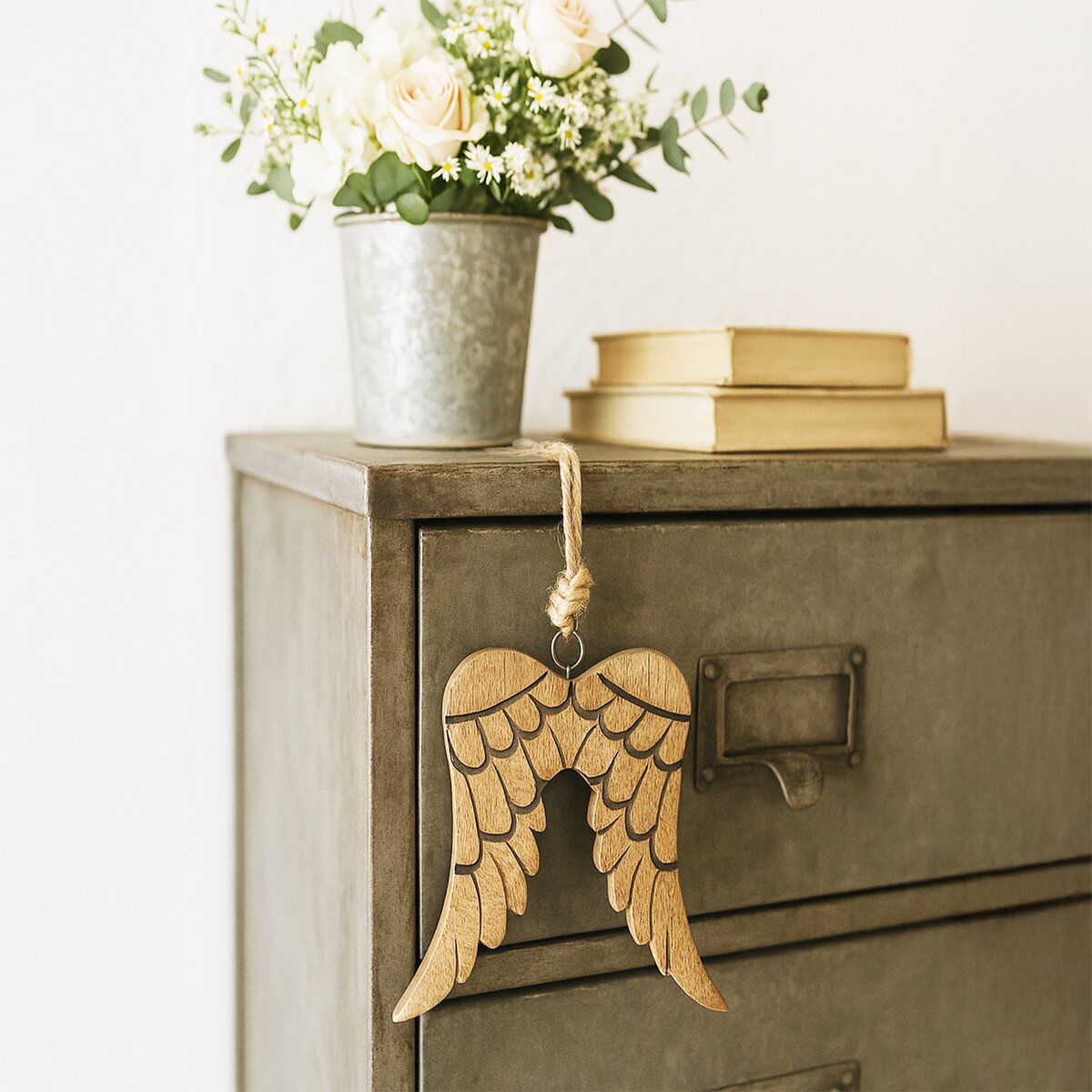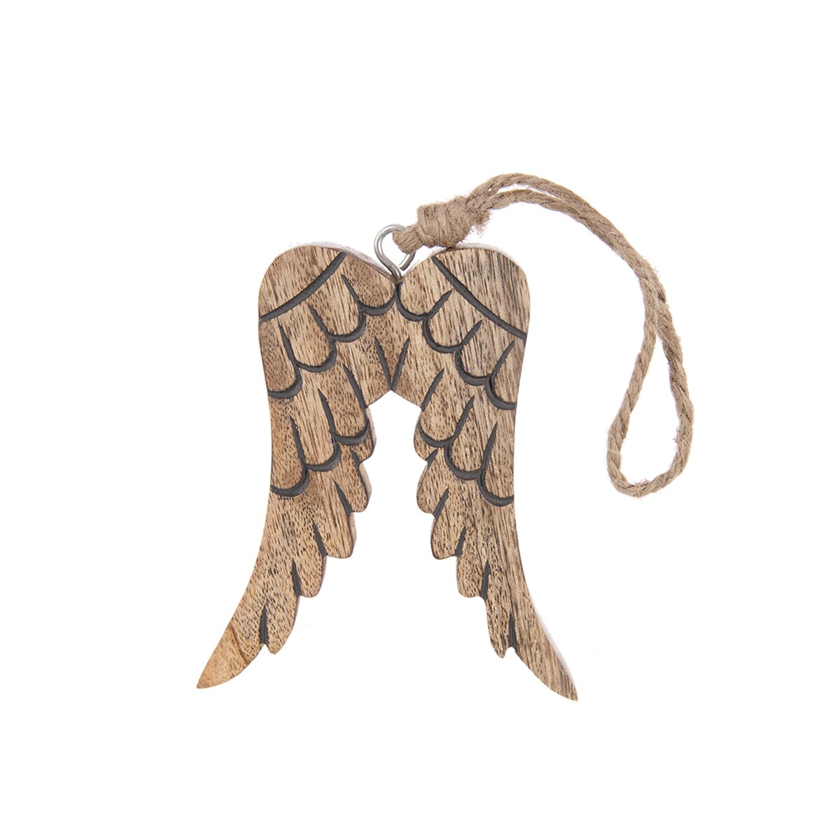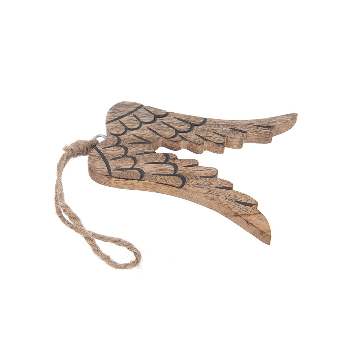 Kód produktu 351874Dekorácia ANJELSKÉ KRÍDLA na zavesenie ozdobí vašu domácnosť nielen v období Vianoc, využiť ju môžete po celý rok. Vhodná tiež ako darček. Materiál: mangové drevo, kov, juta. Rozmery: š. 11,8 cm, v. 13,8 cm, v. s povrazom 29,5 cm.