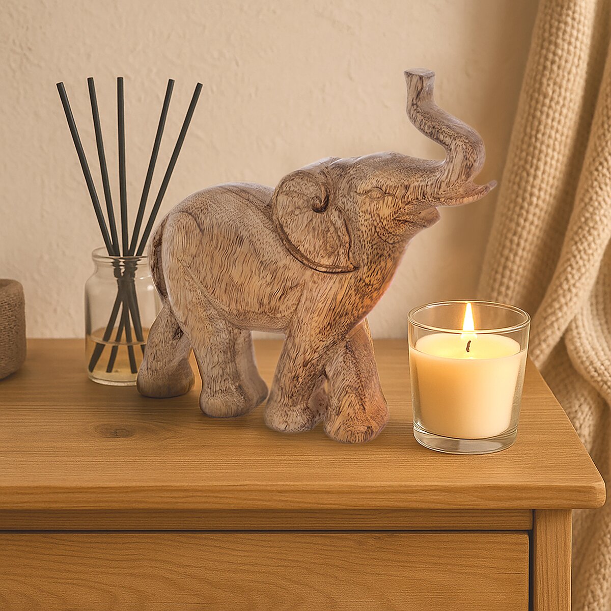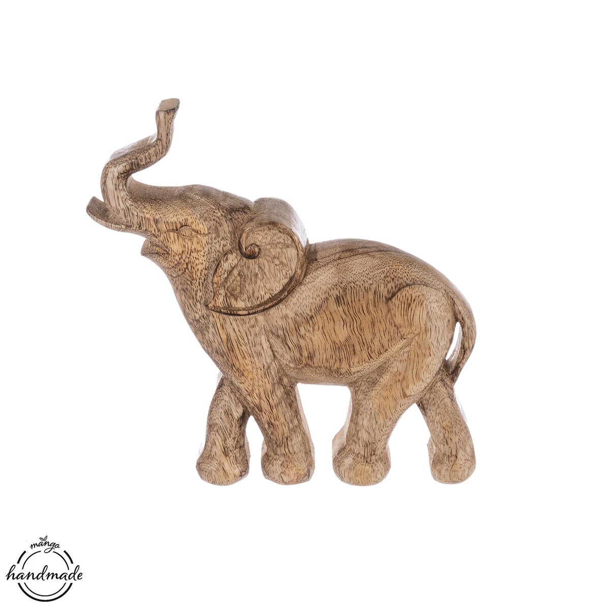 Drevená dekorácia slona prinesie do vášho domova symbol sily, múdrosti a šťastia. Táto nádherná dekorácia, vyrezávaná z pravého mangového dreva, zobrazuje slona s chobotom nahor, ktorý je tradične vnímaný ako talizman šťastia, ochrany a prosperity. Každý slon je originálny kus s dušou – jemné detaily a kvalitné remeselné spracovanie zaručujú, že sa stane výrazným doplnkom každej miestnosti. Vhodné aj ako darček. Materiál: mangové drevo. Rozmery: š. 19,5 cm, v. 20 cm.