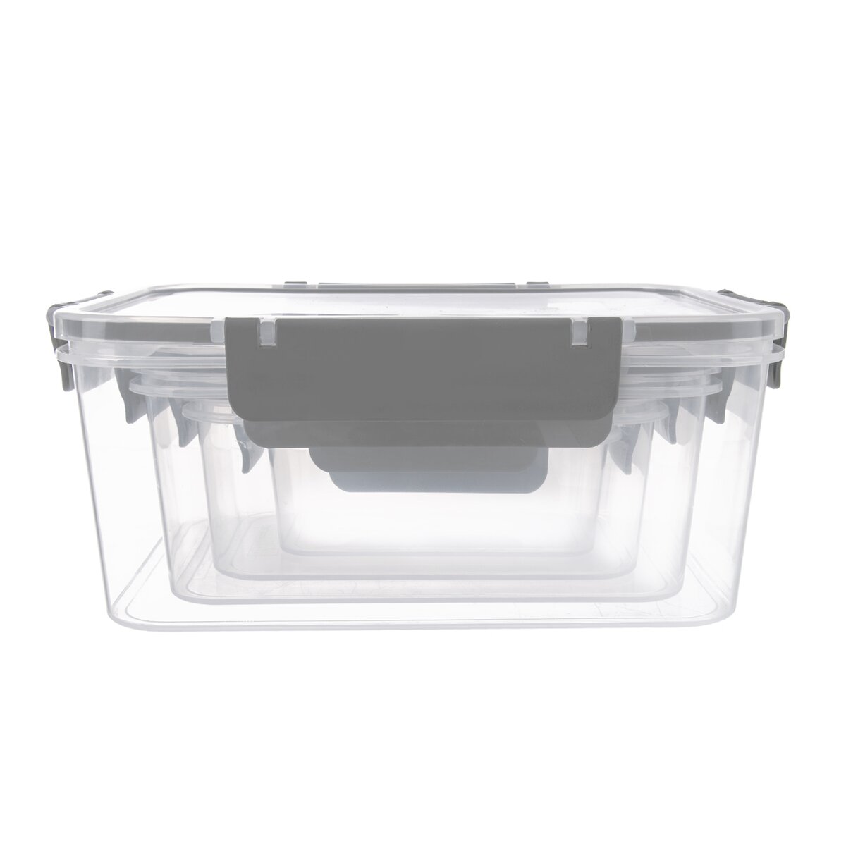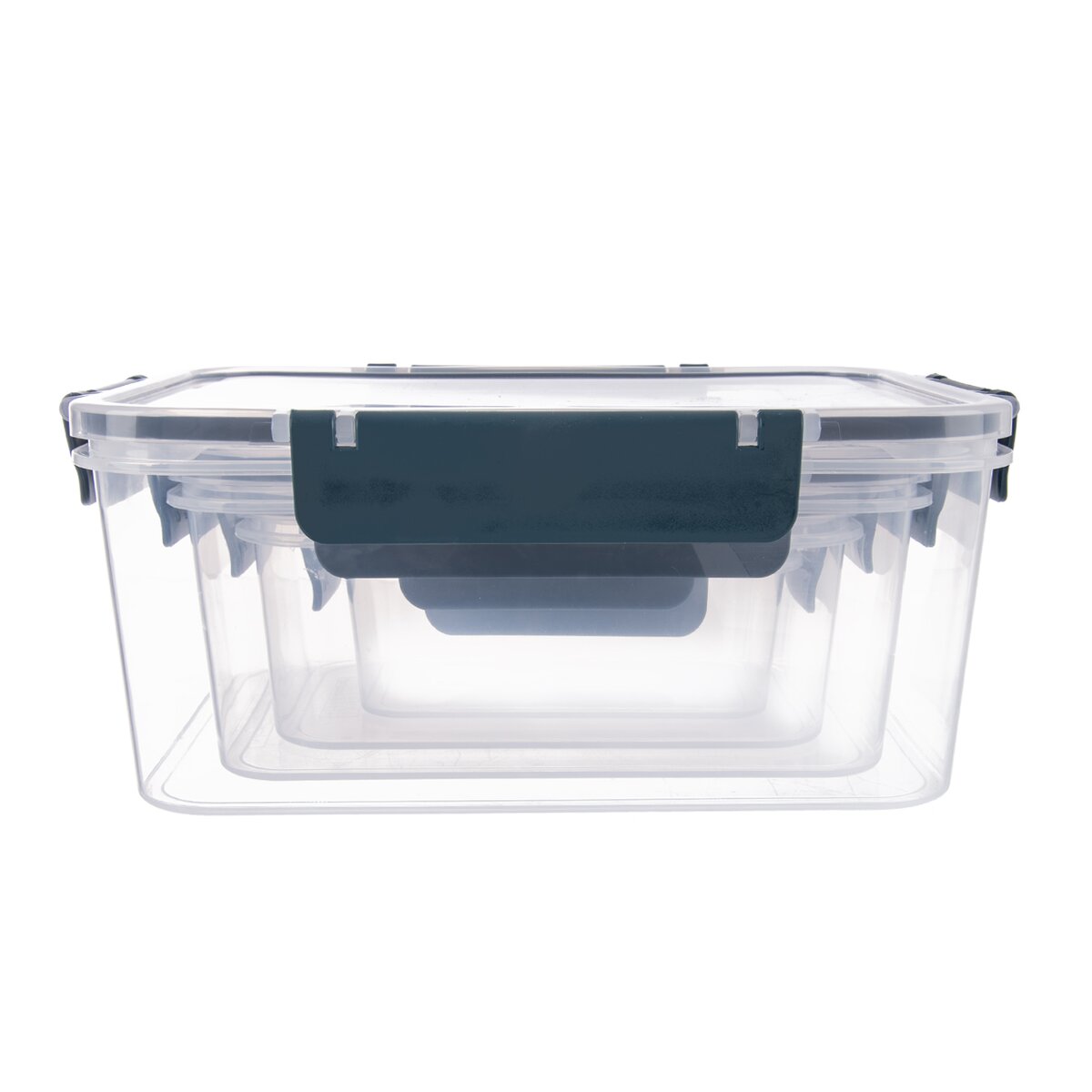 Kód produktu 154507Sada 4 transparentných obdĺžnikových dóz s viečkami na klipy a so silikónovým tesnením majú objem 0,375 l, 0,9 l, 1,7 l a 2,85 l. Hodí sa na uloženie surovín na varenie a pečenie, na prevážanie hotových jedál do práce, na výlety, na uložený drobností v domácnosti.