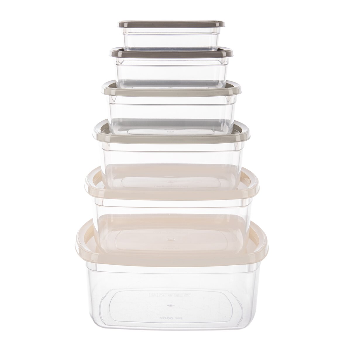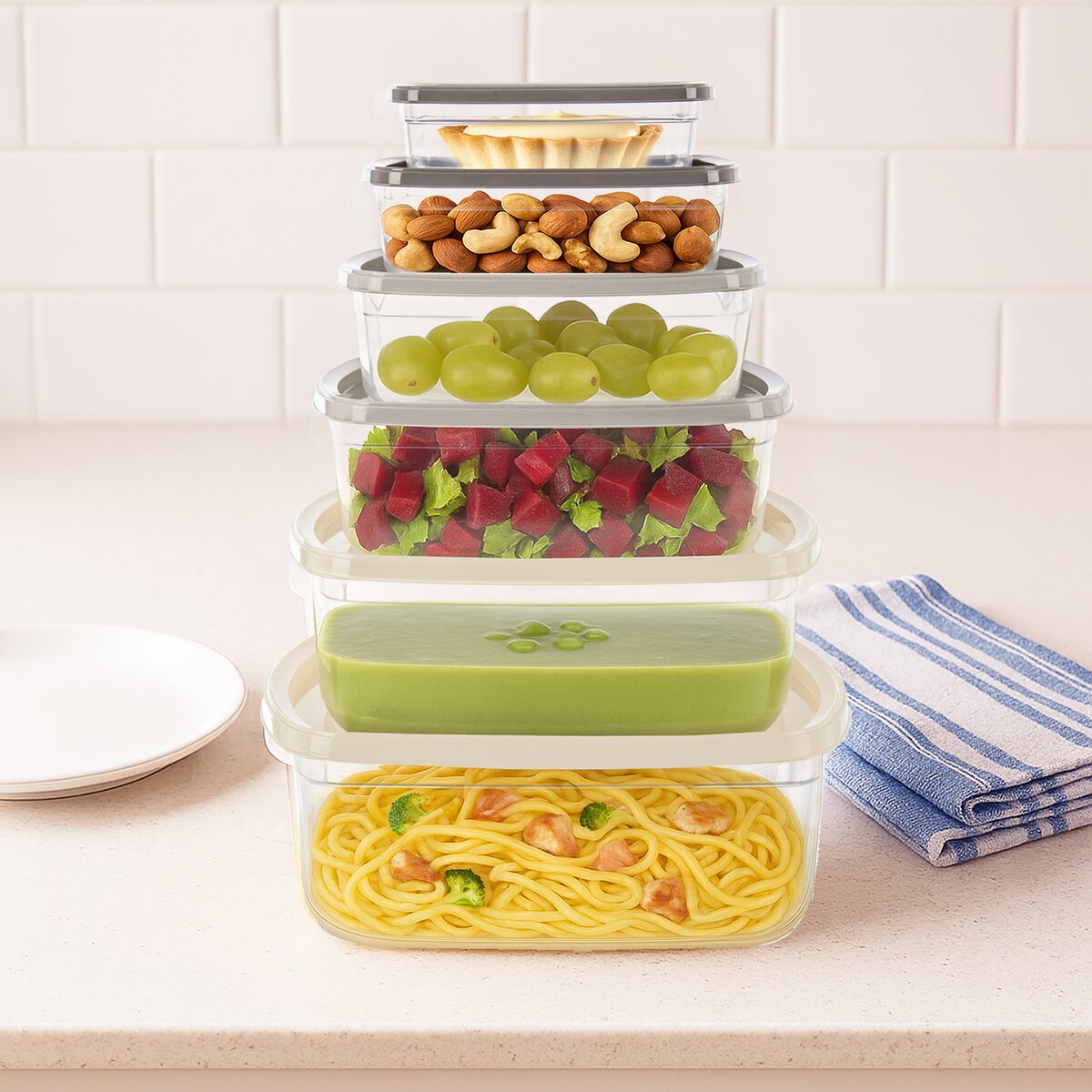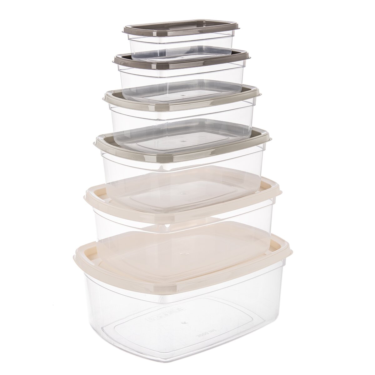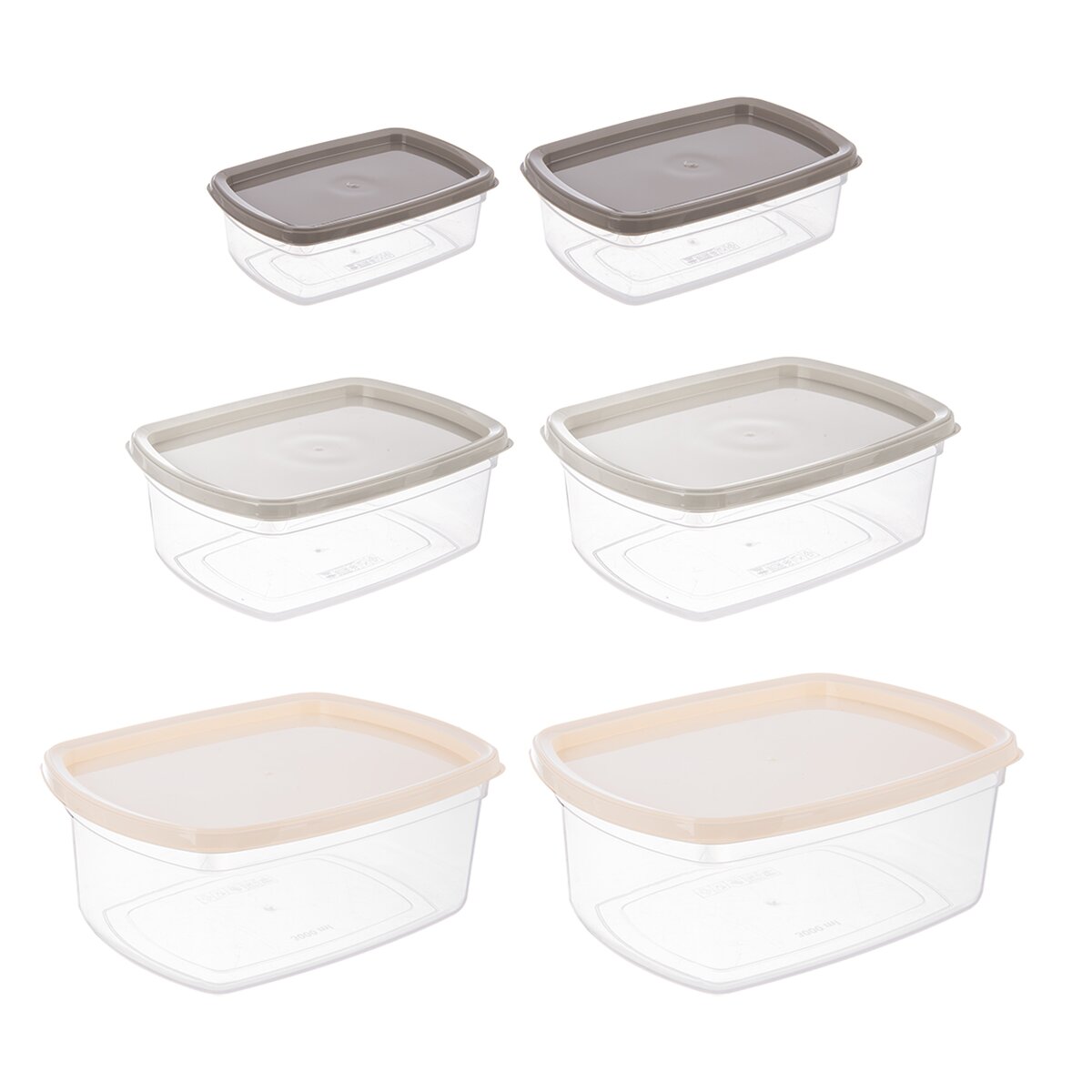 Kód produktu 154509Sada plastových obdĺžnikových dóz rôznych objemov je praktickým pomocníkom na uchovávanie a organizáciu potravín. Obsahuje šesť dóz s objemom 0,225/0,43/0,75/1,22/1,95/3 l, čo umožňuje skladovanie širokej škály surovín – od malých porcií až po väčšie množstvo. Vďaka šikovnému riešeniu je možné všetky menšie dózy vložiť do tej najväčšej, čo výrazne šetrí miesto pri uskladnení. Mix farebných viečok uľahčuje rozlíšenie jednotlivých dóz podľa obsahu alebo účelu použitia. Dózy sú vhodné na použitie v teplotnom rozmedzí od -25 do +95 °C, takže je možné ich používať v mrazničke aj ohrievať (bez viečka) v mikrovlnnej rúre. Sú tiež vhodné na umývanie v umývačke, čo uľahčuje ich údržbu. Materiál: plast PP. Neobsahuje BPA. Rozmery: 23,5x19x10 cm, 21x16x8,5 cm, 18,5x14x7 cm, 16,5x12x6 cm, 14,5x9,5x5 cm, 12,5x7,5x4 cm.