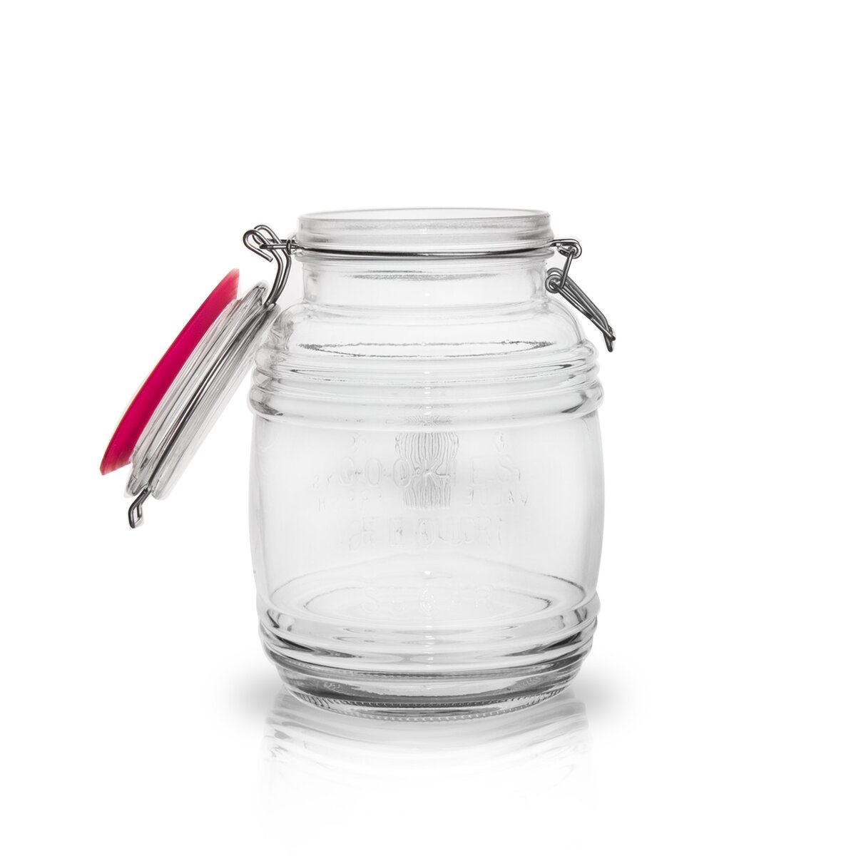 Sklenená dóza s drôteným patentovým uzáverom a so silikónovým tesnením. Tvar súdku. Rozmery: objem 1,8 l, pr. 13 cm, v. 20 cm.
