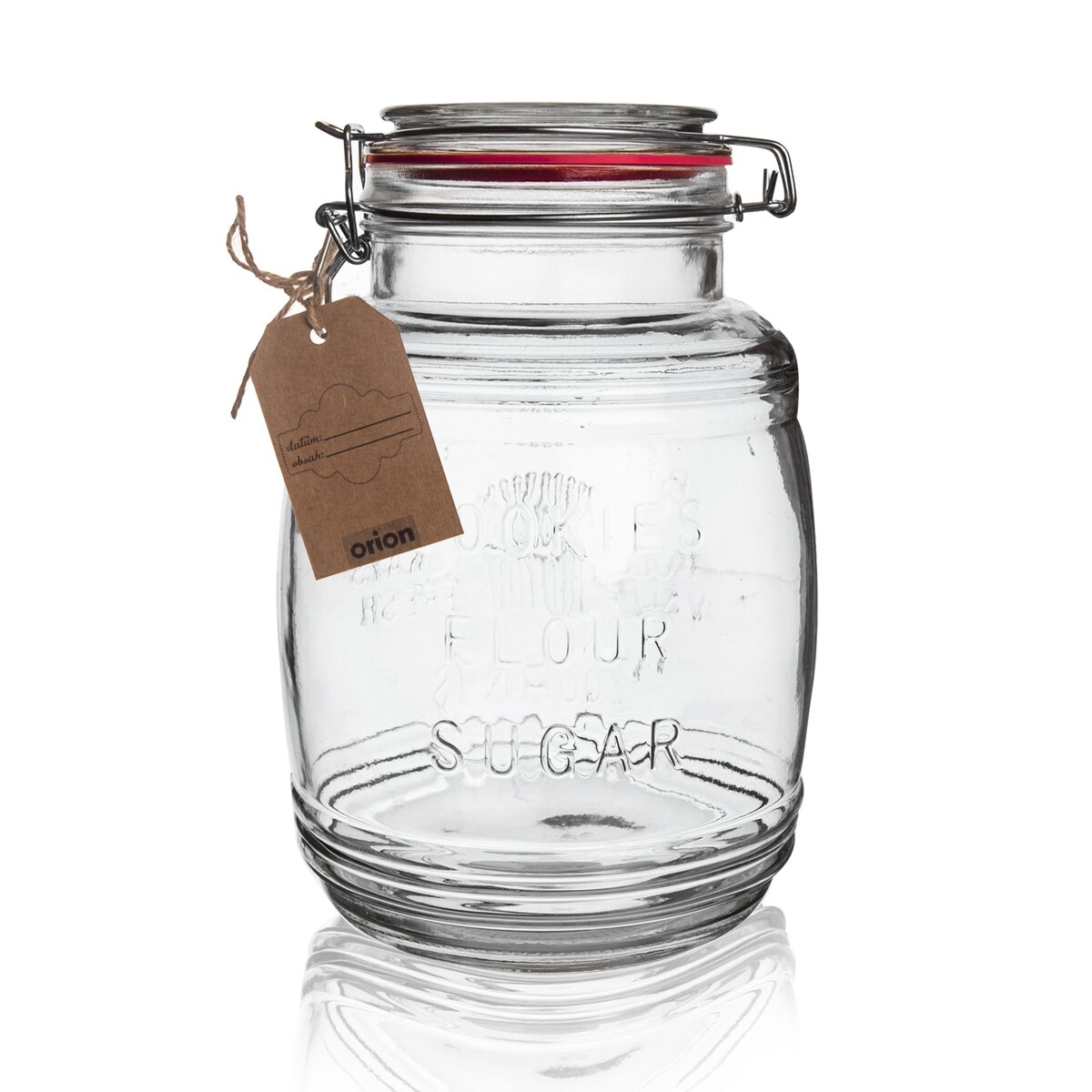 Sklenená dóza s drôteným patentovým uzáverom a so silikónovým tesnením. Tvar súdku. Rozmery: objem 2,3 l, pr. 14 cm, v. 21,5 cm.