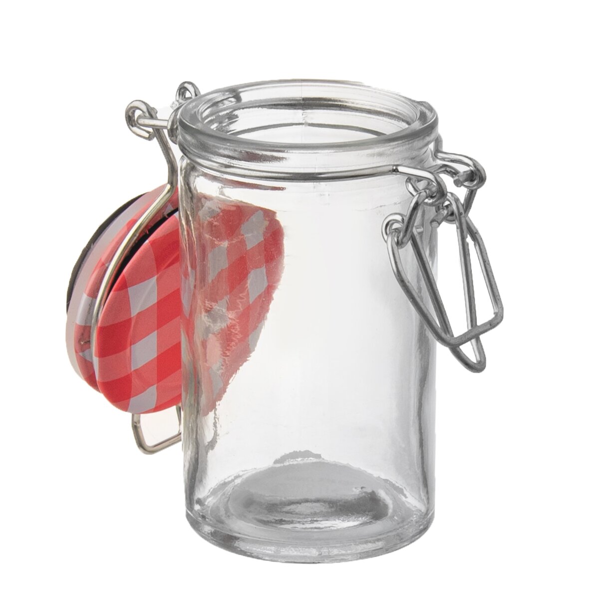 Pevné utesnenie jej obsahu zaisťuje silikónové tesnenie a patentný drôtený uzáver. Pozornosť zaujme svojim červenobielym károvaným viečkom.