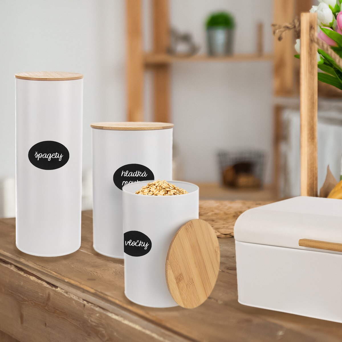 Kód produktu 127542Plechová biela dóza s objemom 2,65 l, s bambusovým viečkom a silikónovým tesnením, vhodná na uloženie špagiet, makarónov, rezancov a iných surovín.