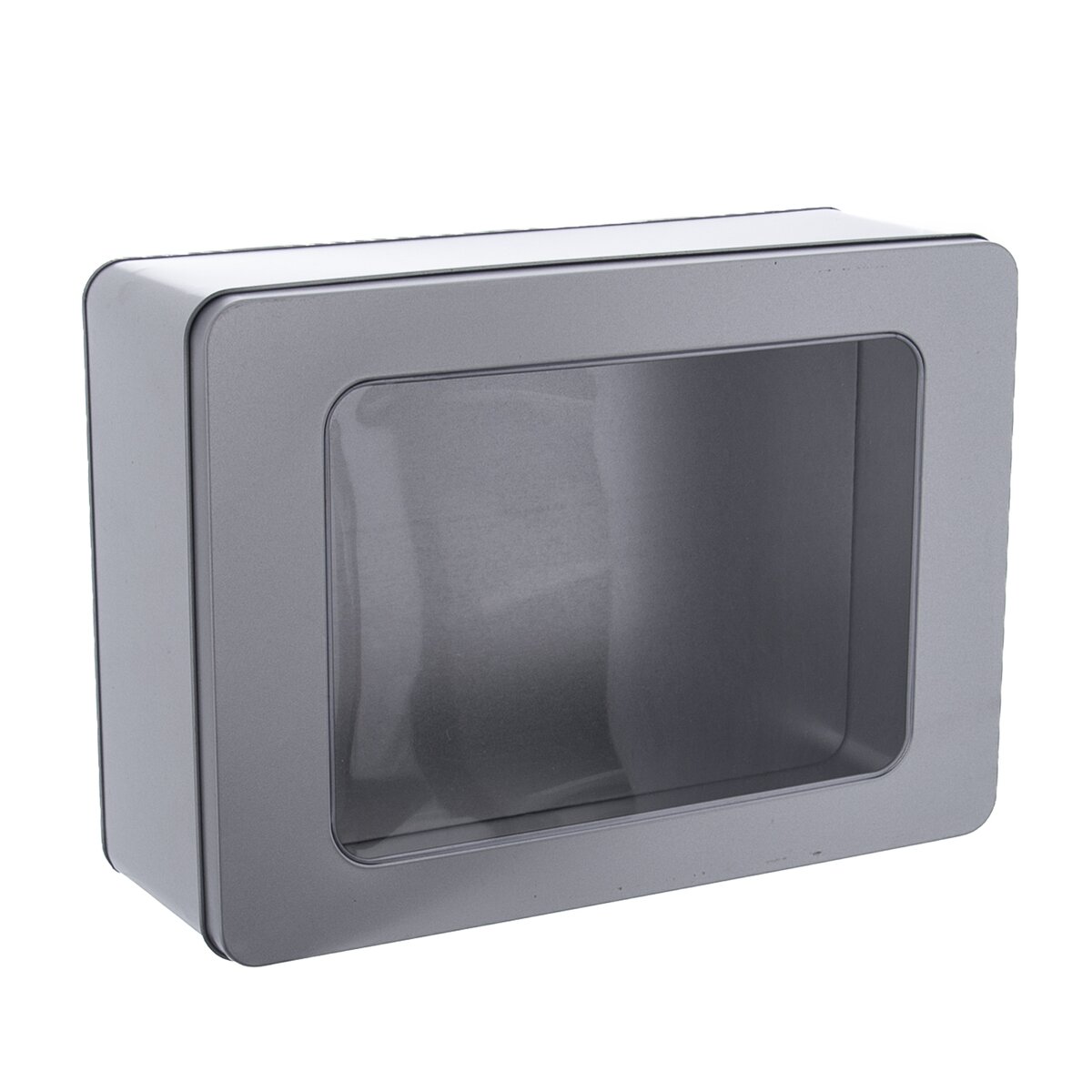 Dóza s viečkom. Skvelá ako darček naplnená vašimi vlastnými cukrovinkami. Priehľadné okienko vo viečku. Materiál: kov, plast. Rozmery: 27x19x9 cm.