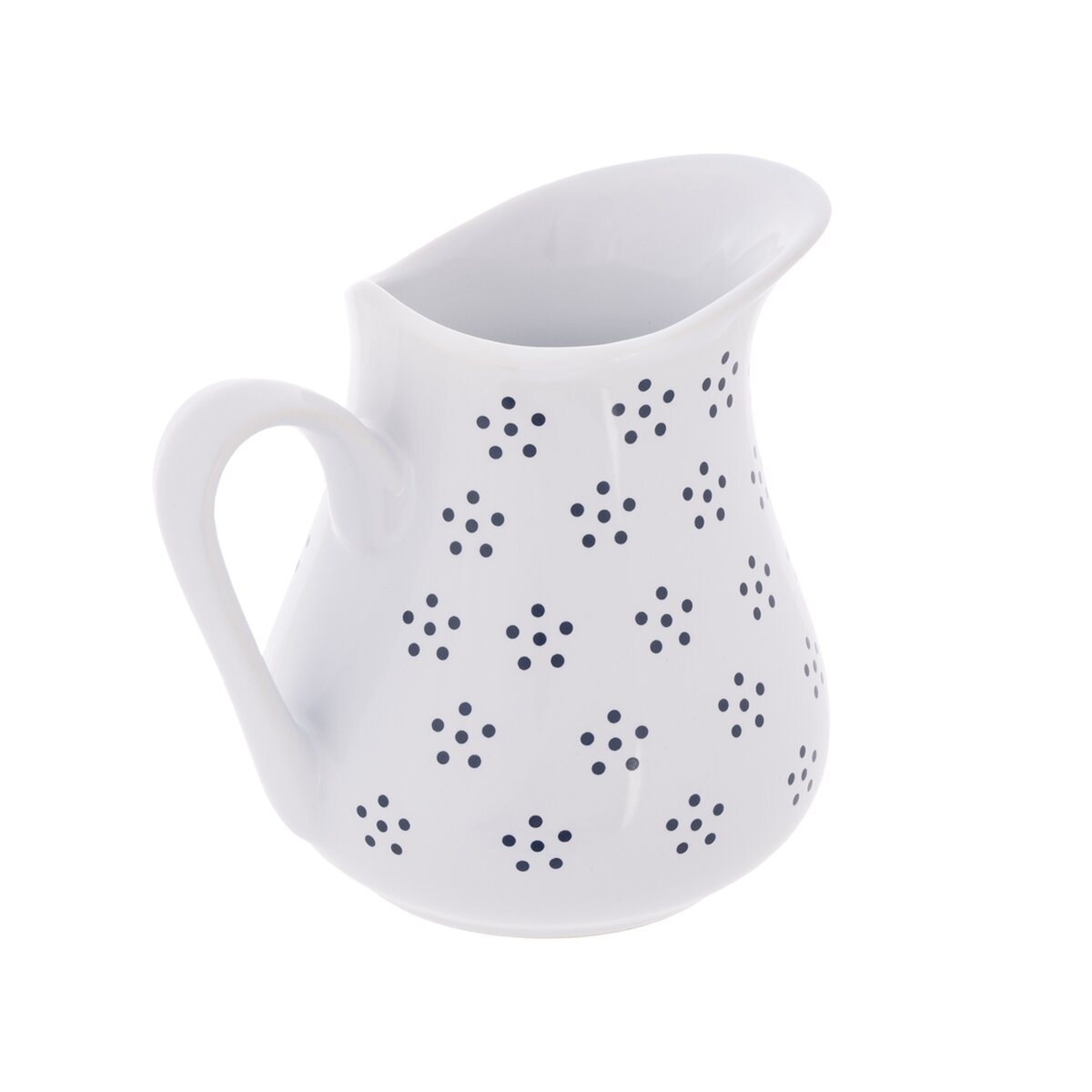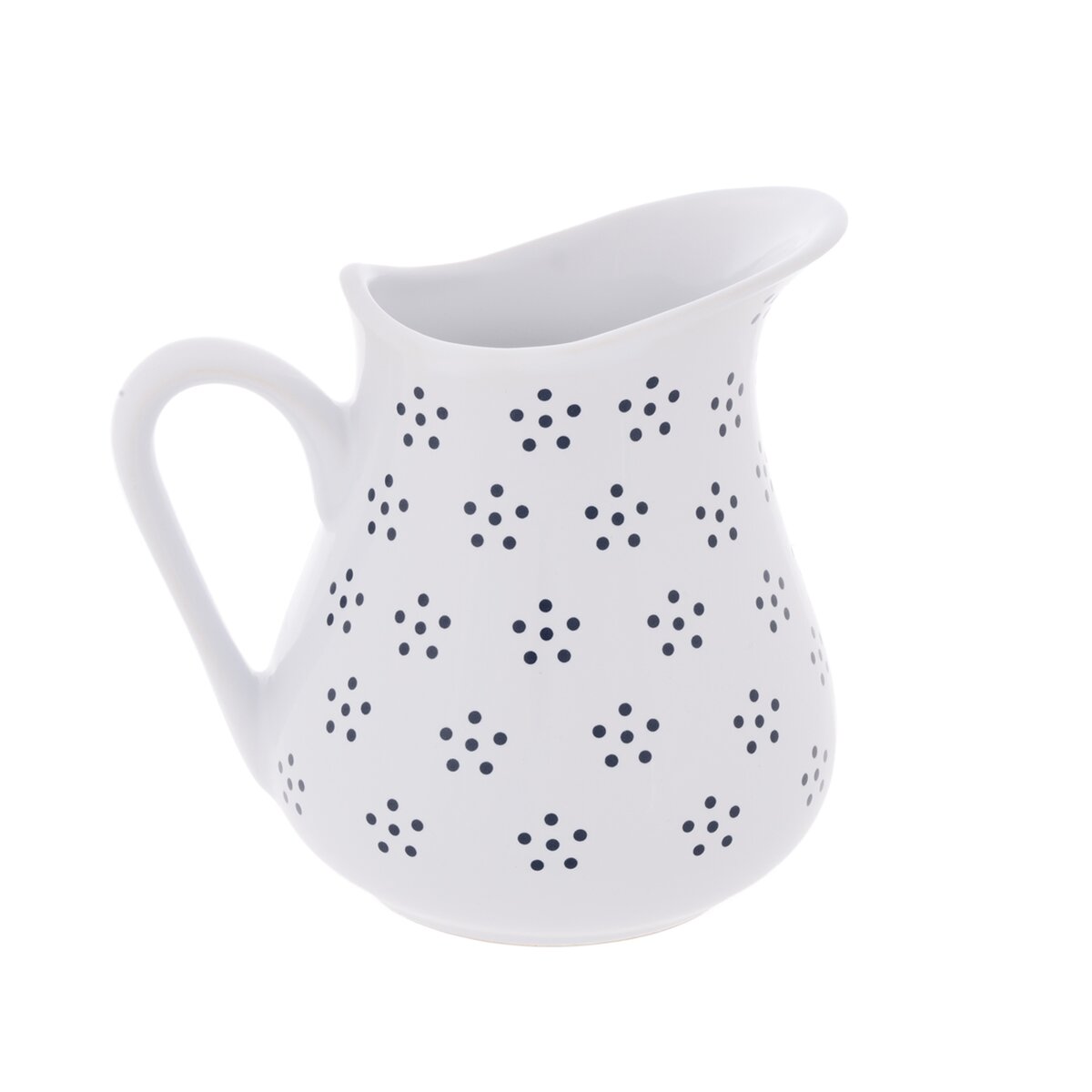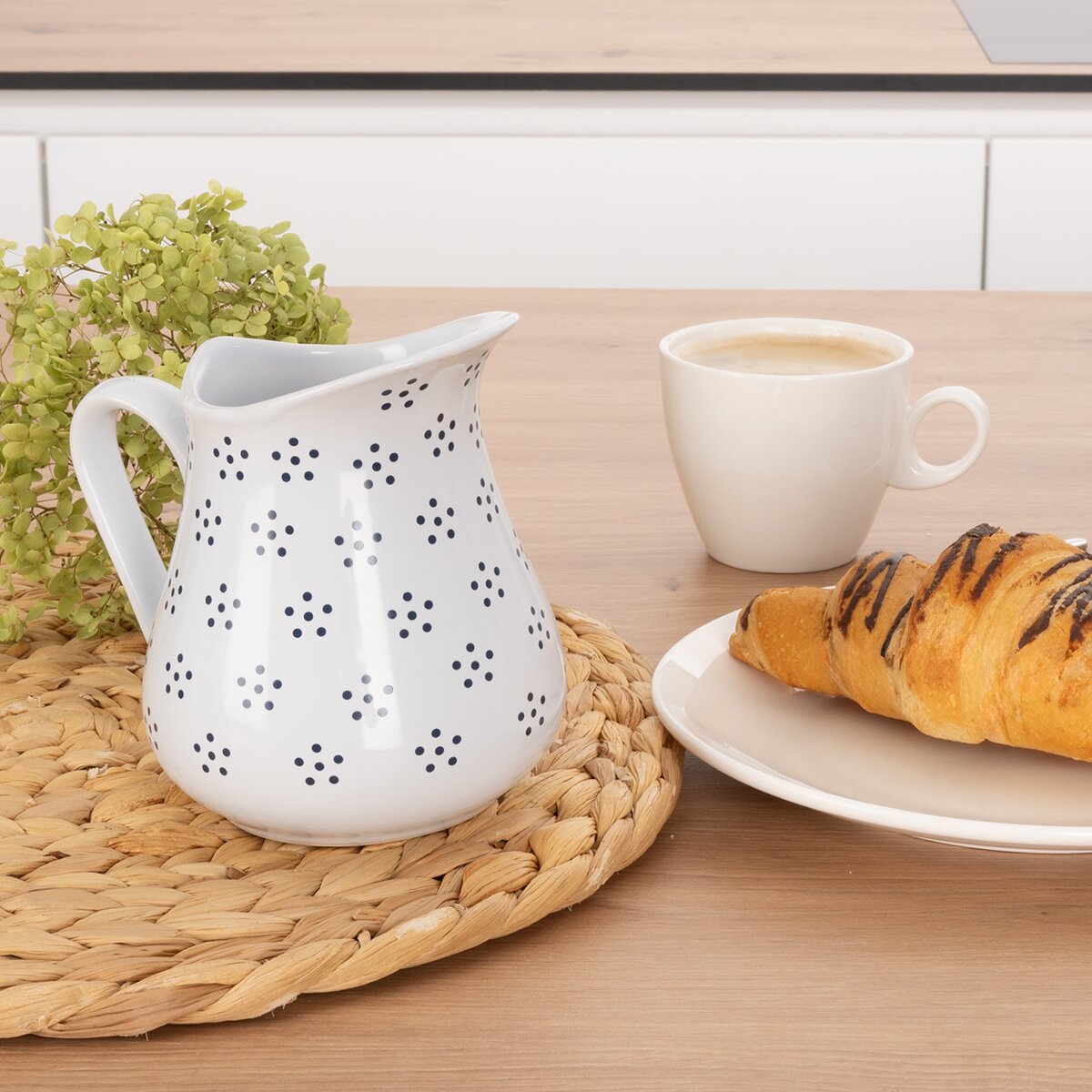 Kód produktu 126687Keramický džbánok je praktickým pomocníkom na podávanie mlieka, smotany alebo domácich limonád. Vďaka svojmu štýlovému a hravému dizajnu však skvele poslúži aj ako dekoratívny prvok na jedálenskom stole alebo v kuchyni – napríklad ako originálna váza na čerstvé či sušené kvety. Spája funkčnosť s estetikou, a preto nájde svoje využitie nielen pri každodennom stolovaní, ale aj ako nápaditý doplnok interiéru. Je vhodný do MVR a umývačky riadu. Materiál: keramika. Rozmery: objem 0,53 l, priemer. 11 cm, š. s uchom 13,5 cm, v. 13 cm.