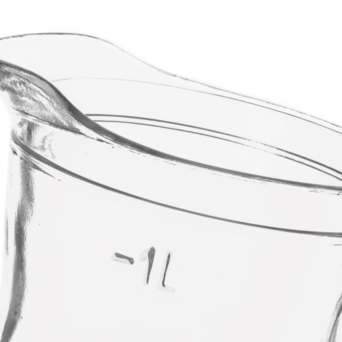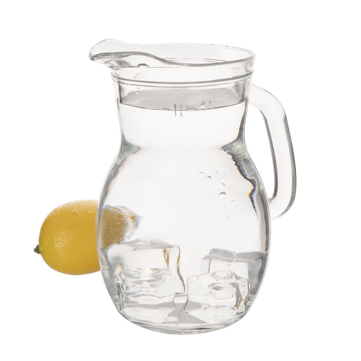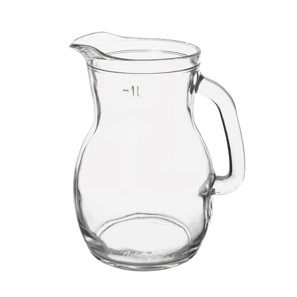 Kód produktu 126664Džbán s uchom a výlevkou. Materiál: sklo. Rozmery: objem 1 l (celkový objem 1,15 l - nad uvedenou ryskou), pr. 12 cm, v. 18,5 cm. Použitie do 60 °C. Je vhodný do umývačky na riad.