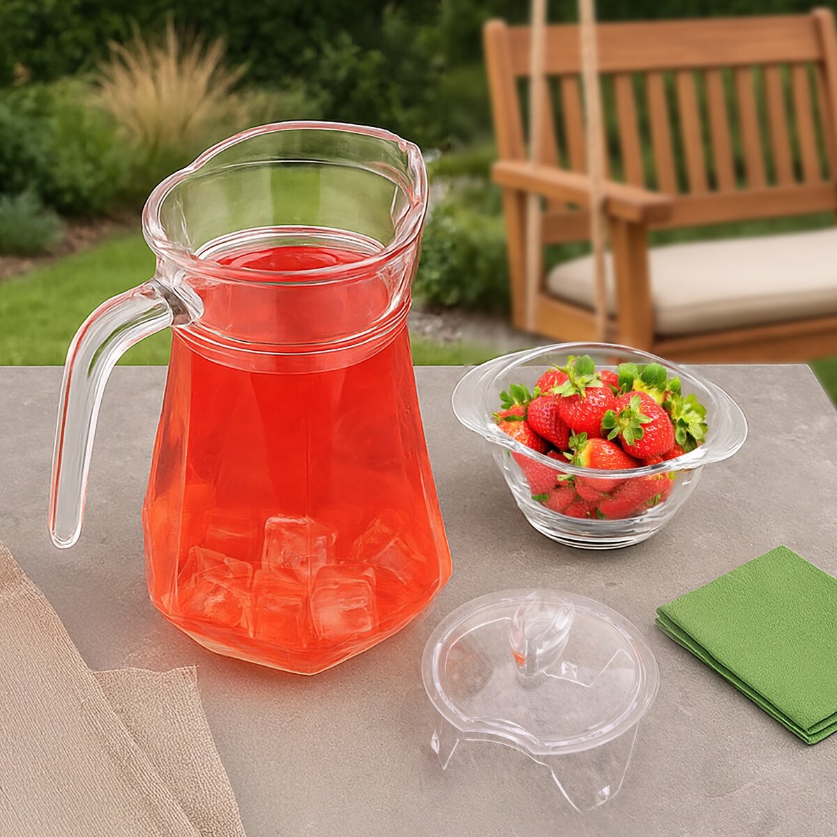 Je uzavretý viečkom, ktoré bráni prenikaniu nečistôt a hmyzu a zároveň umožňuje dlhšie uchovávanie nápoja. Vďaka svojmu čistému dizajnu sa hodí ako na každodenné použitie doma, na záhrade, terase či balkóne, tak aj na servírovanie pri slávnostných príležitostiach, kedy napr. k dobrému vínu alebo káve chcete hosťom podávať aj čistú vodu. Džbán je odolný teplotám až do 60 °C, nie je teda vhodný pre vriace nápoje. Úžitkový objem s použitím viečka je 1 liter. Viečko je vyrobené z plastu PP.