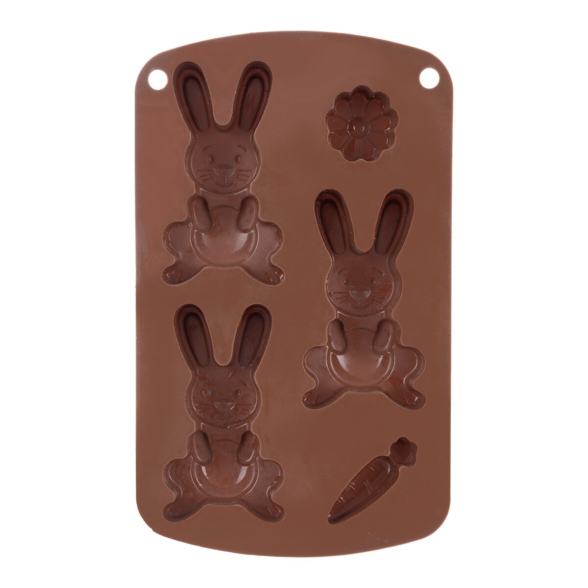 Kód produktu 151746Nepriľnavá hnedá veľkonočná silikónová forma pre rýchle a rovnomerné pečenie 5 ks sušienok alebo na výrobu originálnej čokolády.