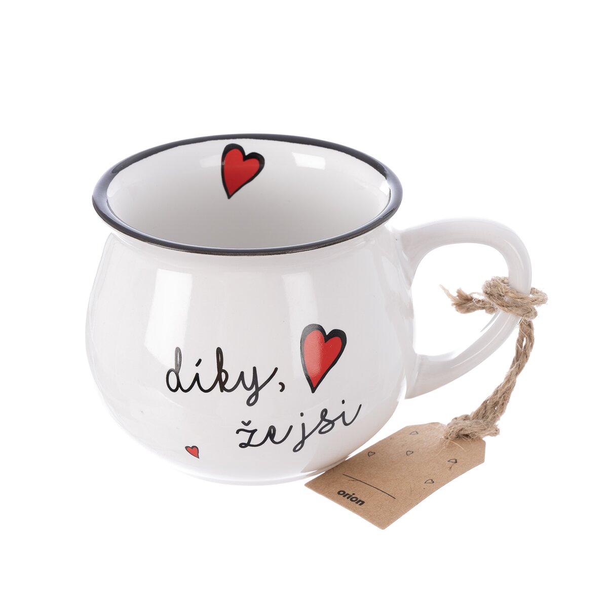 Kód produktu 132222Hrnček s uchom s dekorom ĎAKUJEM, ŽE SI. Súčasťou je visačka na venovanie. Materiál: keramika. Je vhodný do umývačky riadu a MVR. Rozmery: objem 0,3 l, priemer. 9,5 cm, v. 7,5 cm. Designed by Orion.