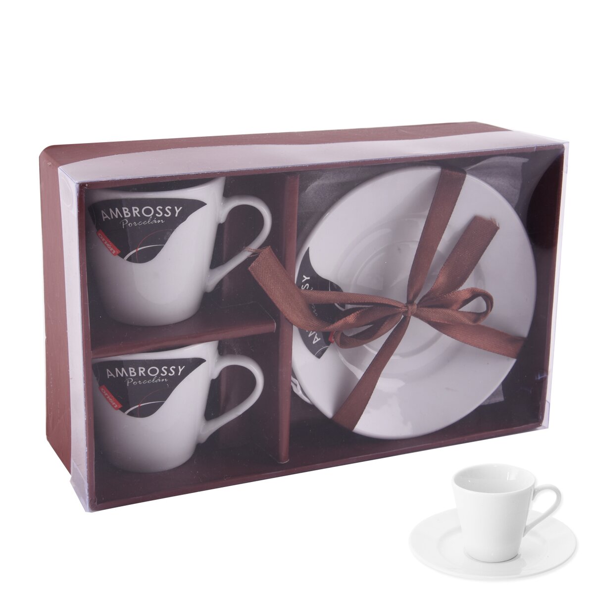Hrnček s uchom a podšálkou. Materiál: porcelán. Farba biela. Súprava 2+2 ks. Rozmery: objem 0,09 l, pr. š. 6 cm, pr. podš. 12 cm.