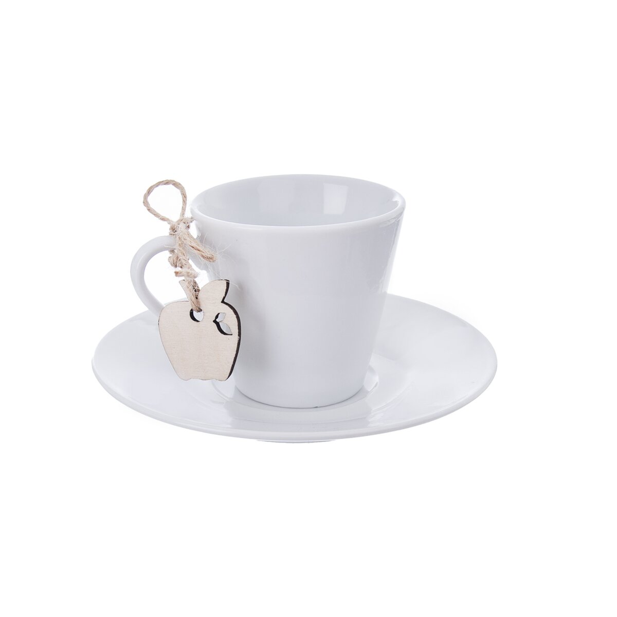 Kód produktu 610827Hrnček s uchom, podšálka a prívesok. Materiál: porcelán, drevo. Farba biela. Rozmery: objem 0,09 l, pr. š. 6 cm, pr. podš. 12 cm, prívesok 2,5x2,5 cm.