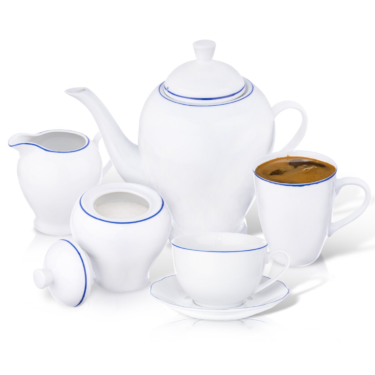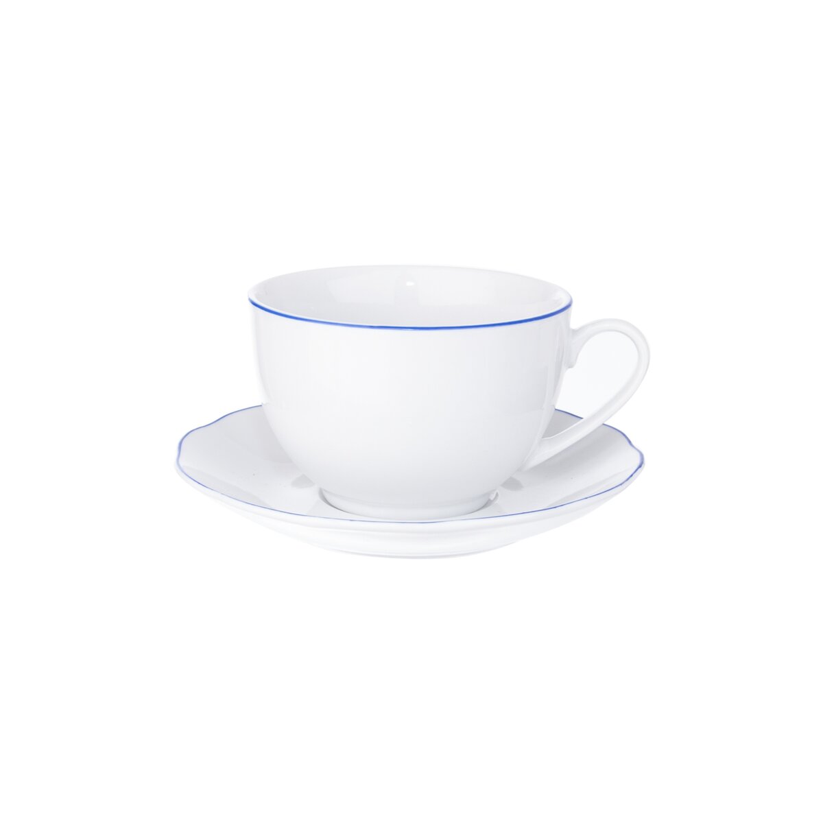 Kód produktu 127222Hrnček s podšálkou s modrou linkou. Materiál: porcelán. Rozmery: 0,28 l, pr. 9 cm, v. 6 cm, podšálka pr. 14 cm.