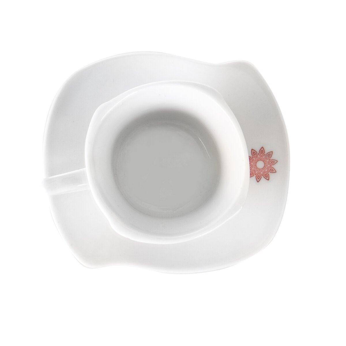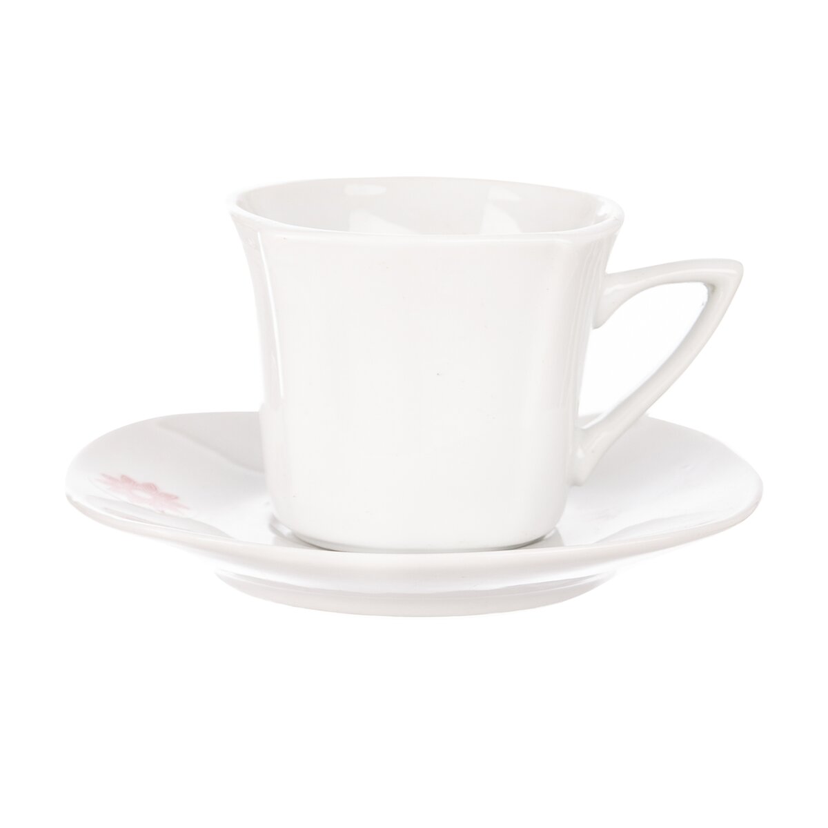 Kód produktu 127000Hrnček s podšálkou. Materiál: porcelán. Rozmery: objem 0,1 l, pr. 6 cm, v. 5,5 cm, podšálka 12x12 cm.