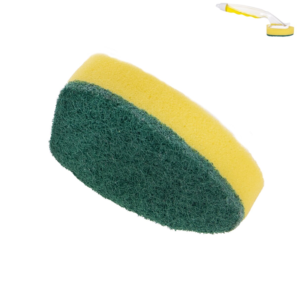 Náhradná hubka na riad k dávkovači saponátu. Tvar hubky umožní lepší prístup do rohov pekáčov, foriem… Materiál: polyuretánová pena, neškriabavý vlies na teflón a sklokeramické dosky, plast. Rozmery: 6x9x2,5 cm.