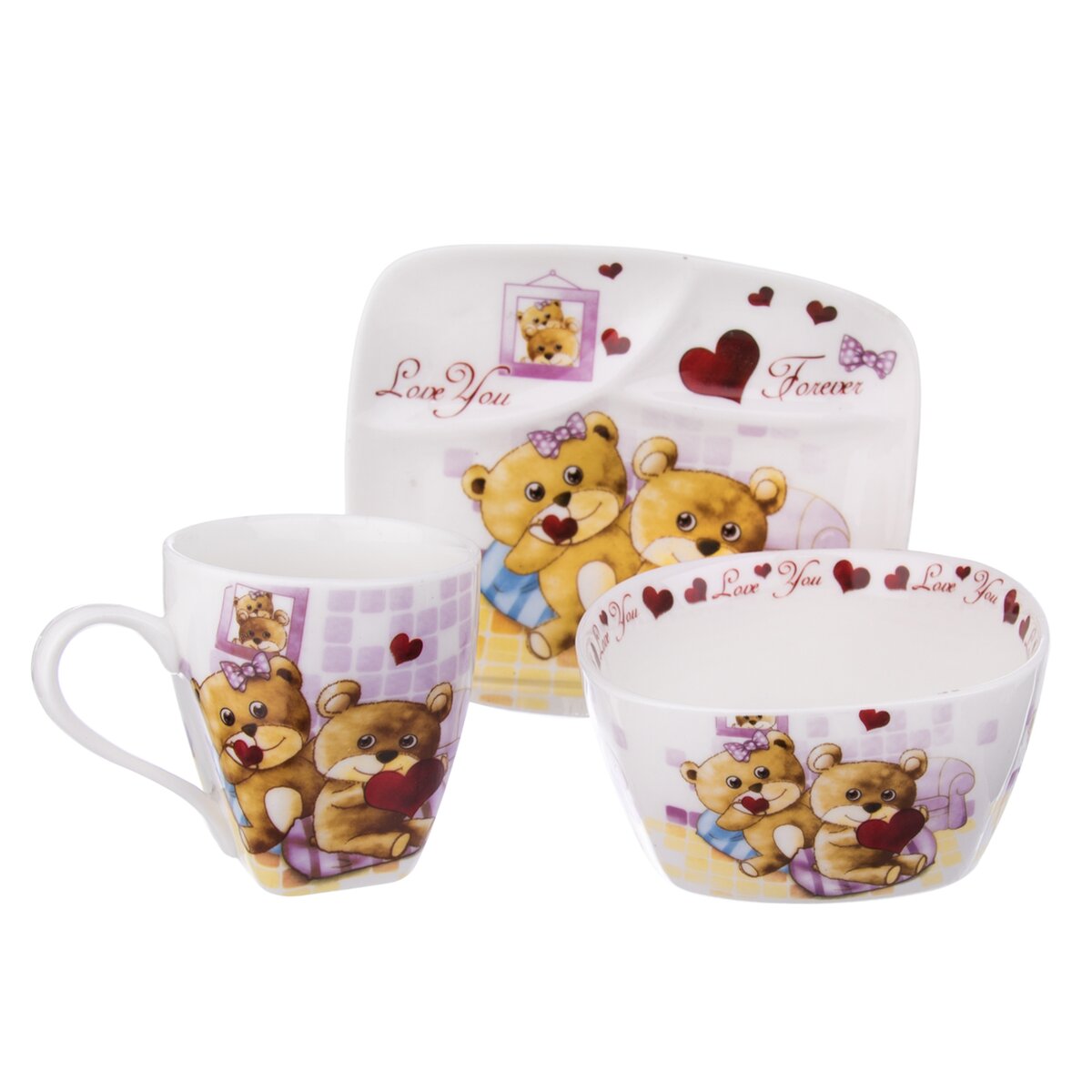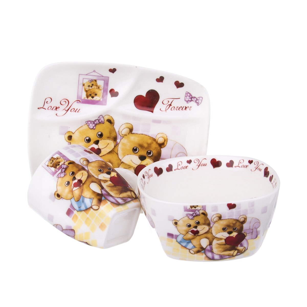 Sada jedálenská porcelánová s dekorom MEDVEDÍKOV poteší vaše deti. Sada obsahuje hrnček, misku a plytký hranatý tanierik. Darčekové balenie. Materiál: porcelán. Rozmery: hrnček - 0,2 l, pr. 7 cm, v. 8 cm, miska – 12x12x5,5 cm, tanierik – 17x14,5 cm. Riad je možné umývať v umývačke na riad a používať v mikrovlnnej trúbe.