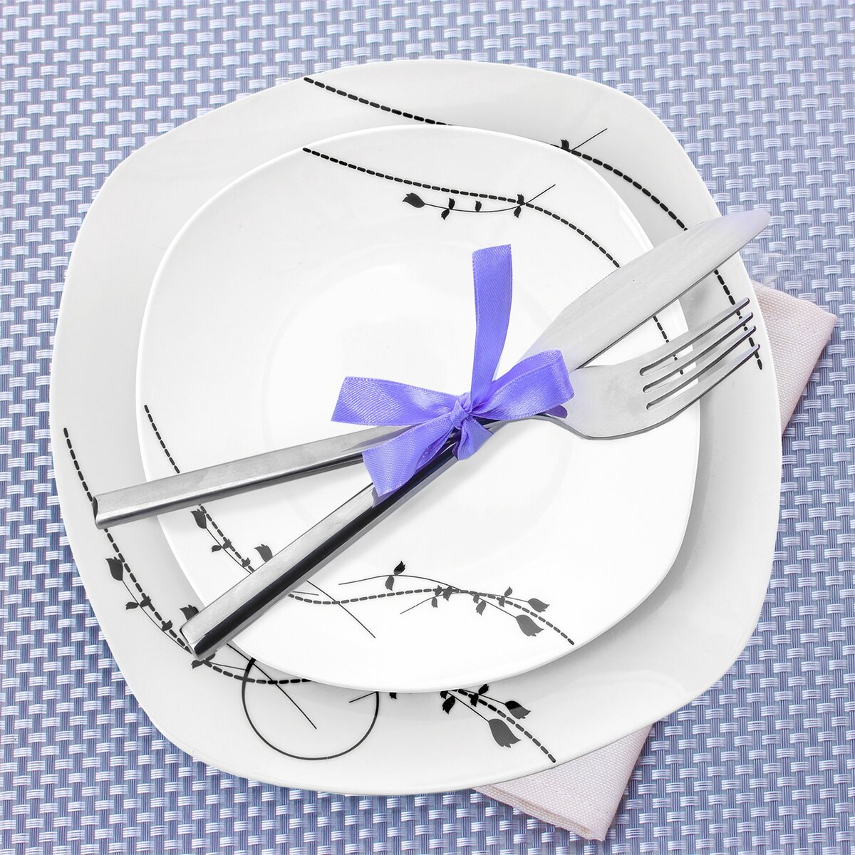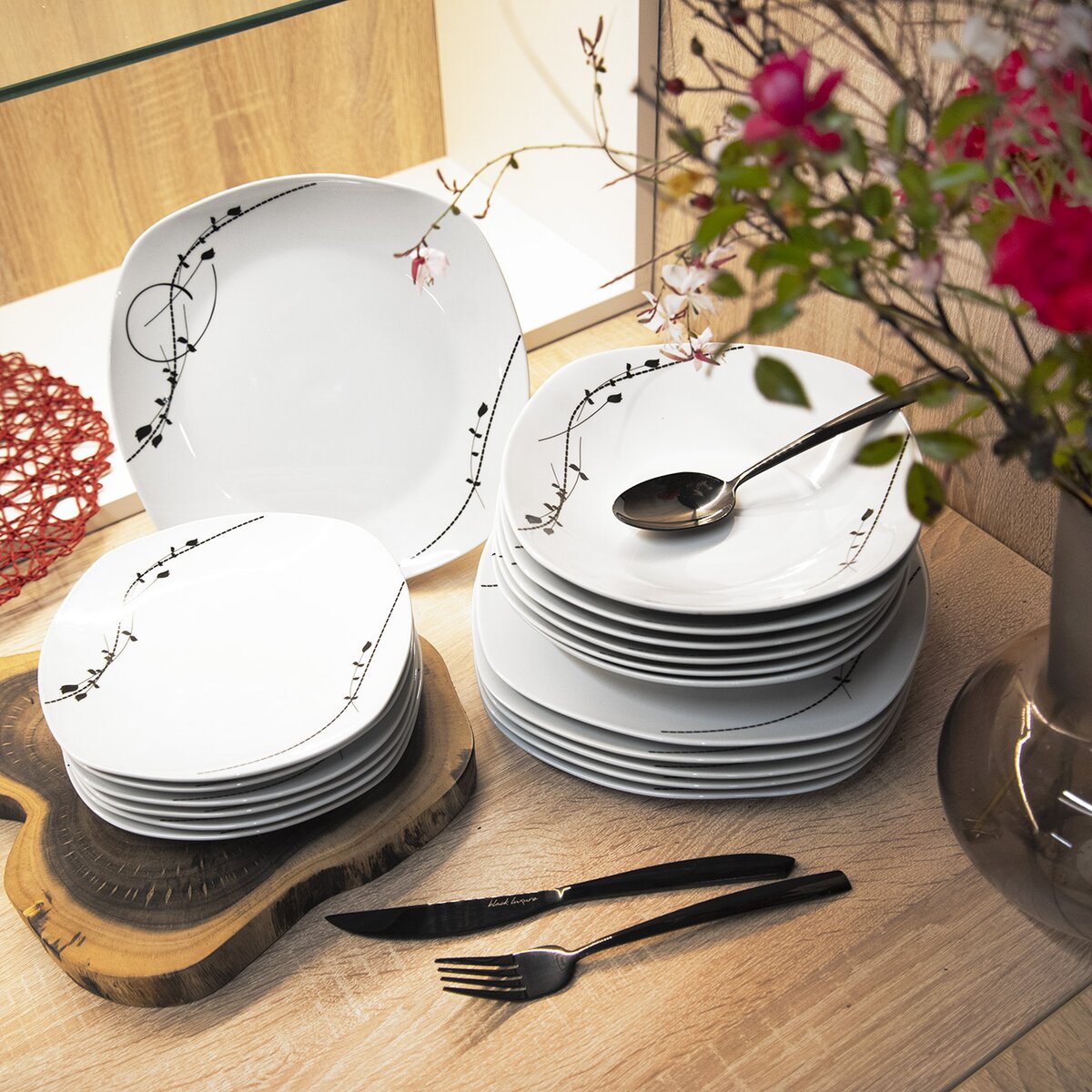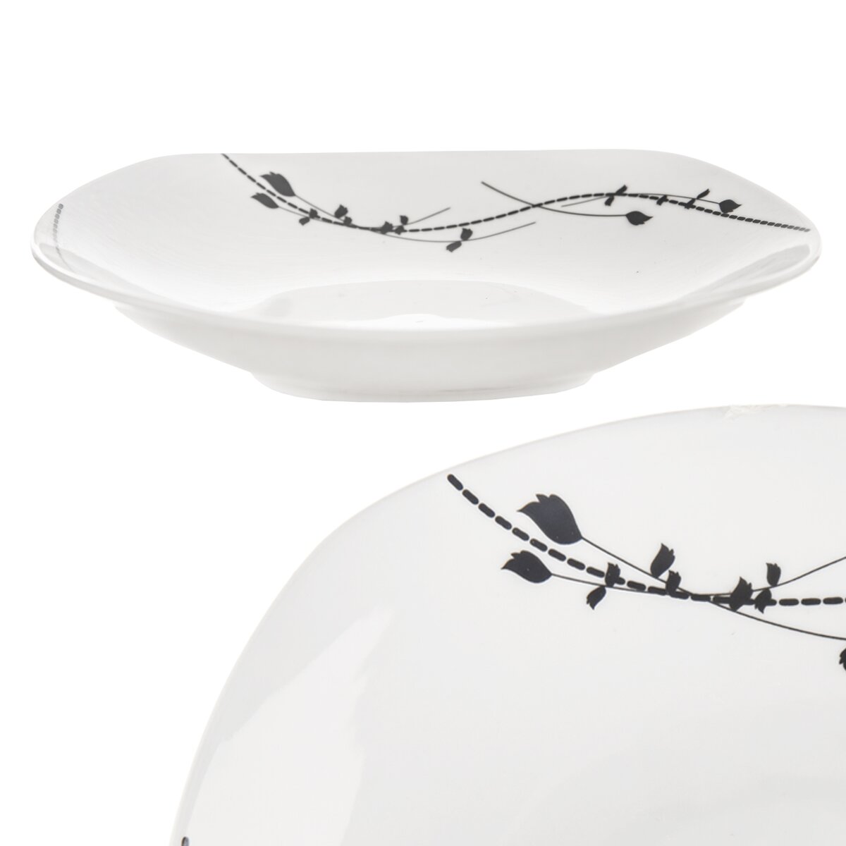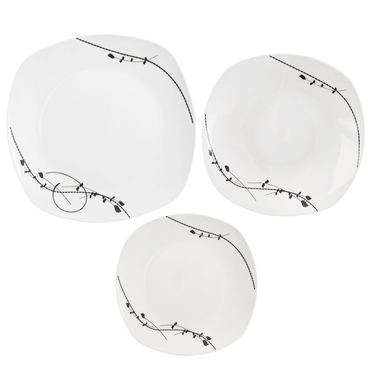 Kód produktu 112355Jedálenská porcelánová sada sa skladá zo 6 hranatých dezertných, 6 plytkých a 6 hlbokých tanierov s jemným čiernym rastlinným dekorom.