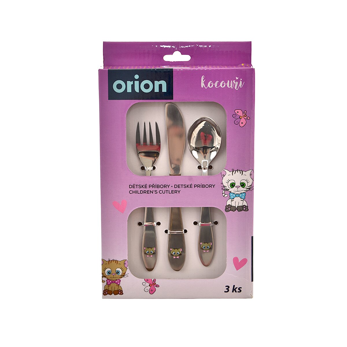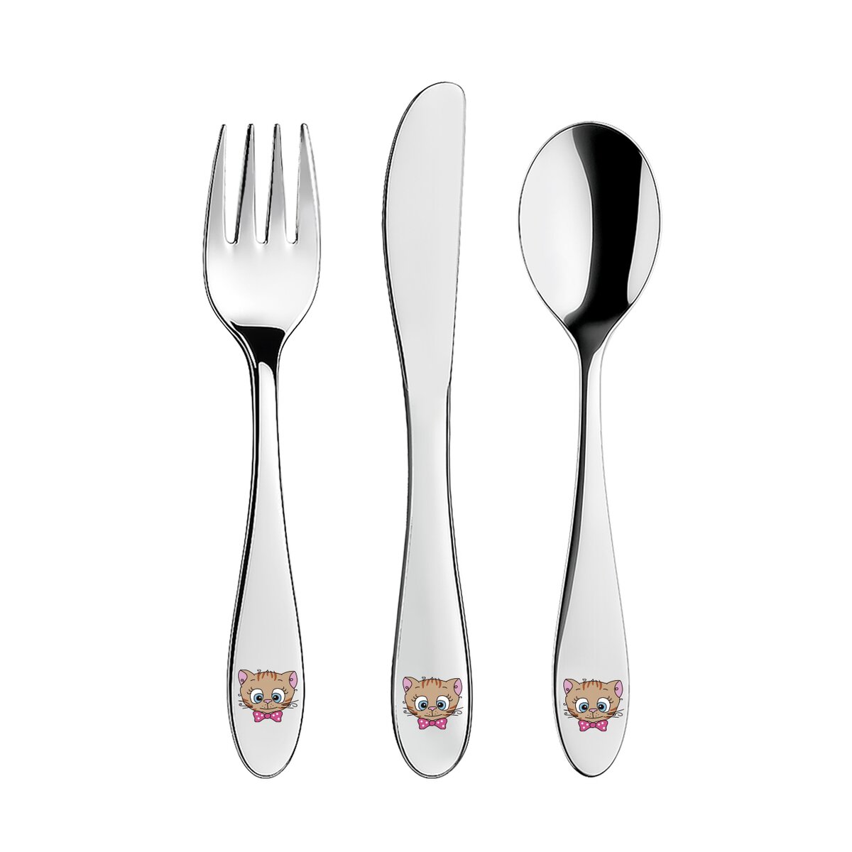Príbory s motívom roztomilých kocúrikov s mašľou slúžia na nácvik správneho stolovania. Súprava obsahuje lyžicu dĺžky 15,5 cm, vidličku 15 cm a nôž dĺžky 17 cm. Svojou veľkosťou a váhou sú prispôsobené malým detským rúčkam.
