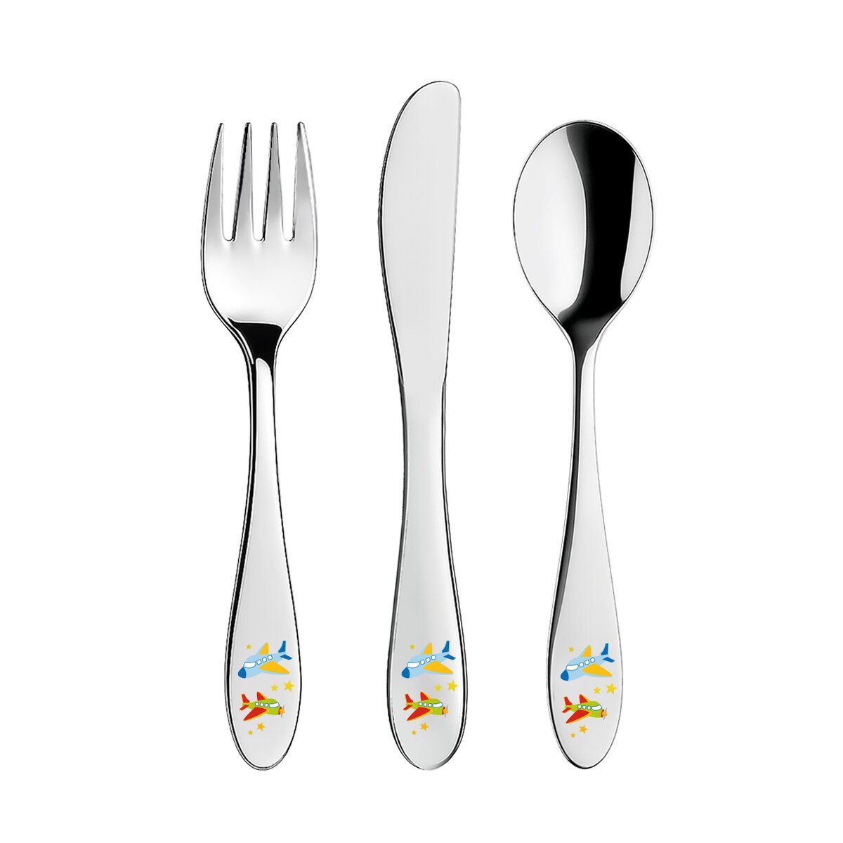 Kód produktu 143617Set detských nerezových príborov s farebným motívom lietadiel obsahuje lyžicu, vidličku a nôž a je určený pre každodenné používanie.