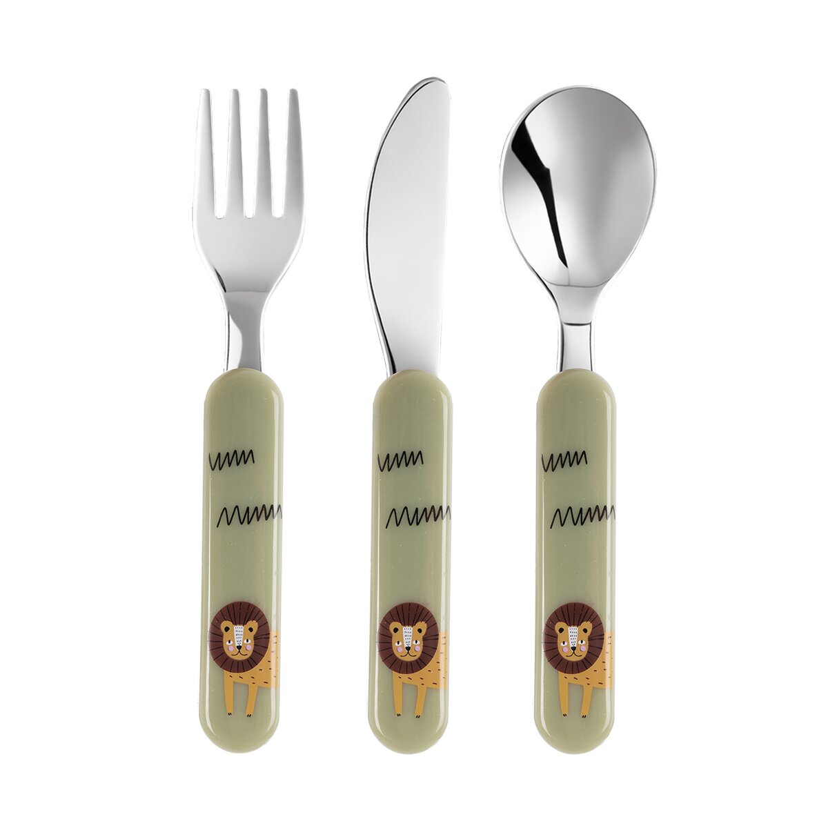 Kód produktu 154219Detský príborový set s veselým motívom zvieratiek na prvé stolovanie. Obsahuje lyžicu, vidličku a nôž. Materiál: nerezová oceľ, plast PS. Tvar prispôsobený detským rukám na jednoduché a bezpečné používanie. Možno umývať v umývačke riadu. Rozmery: (dĺžka/šírka) lyžica 14/3,5 cm, vidlička 13,5/2,5 cm, nôž 14/2 cm.