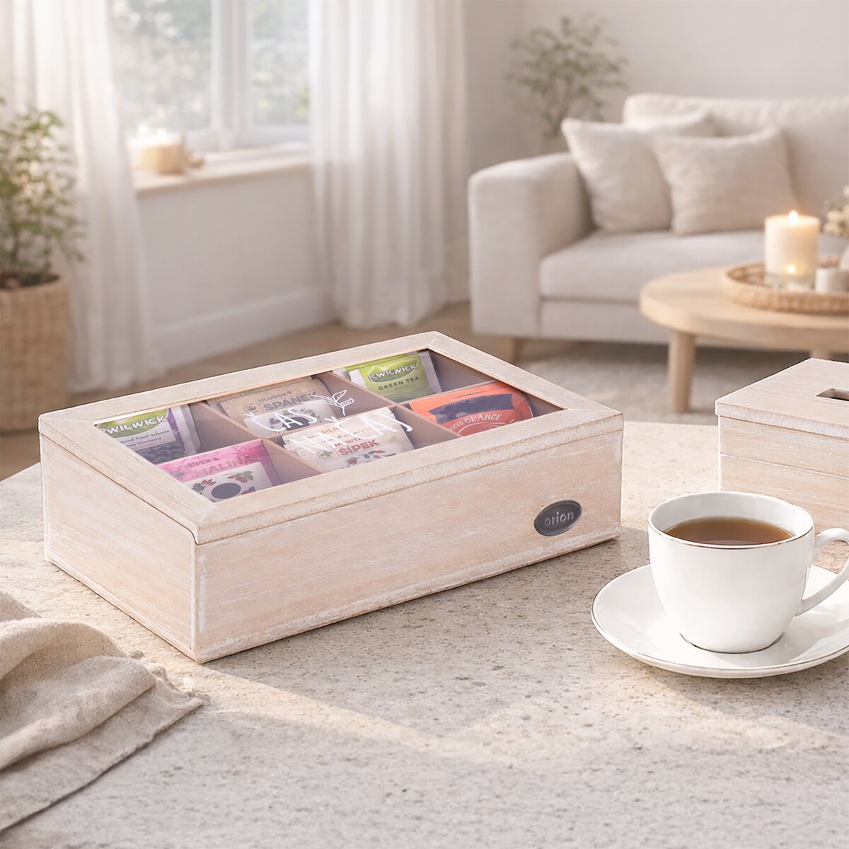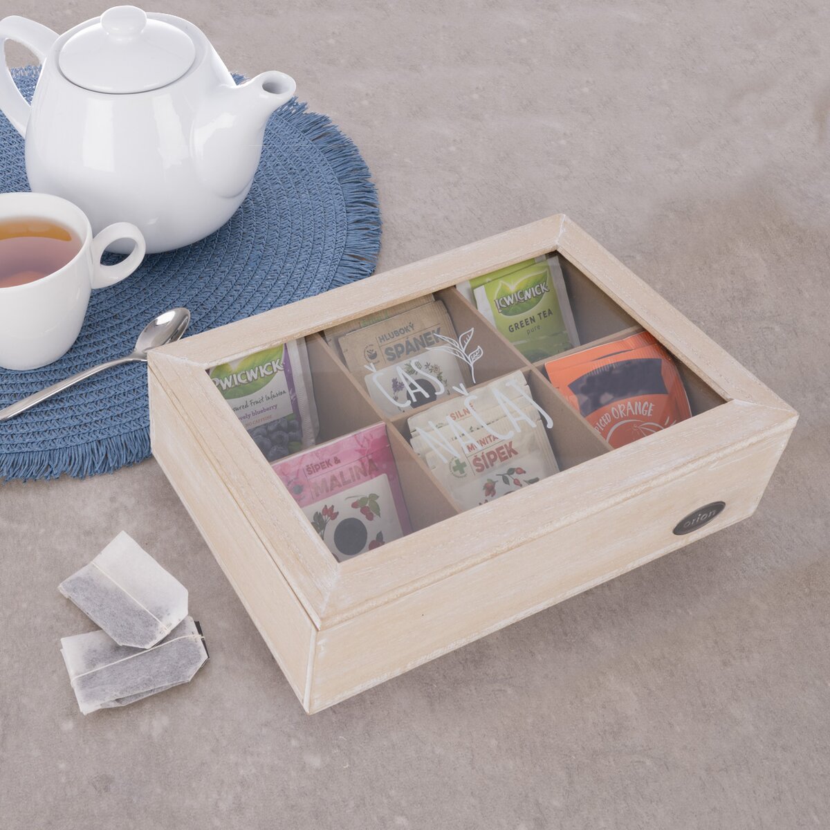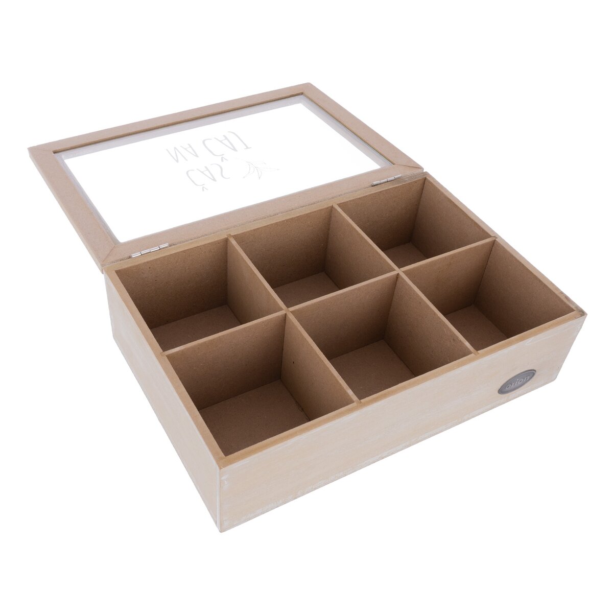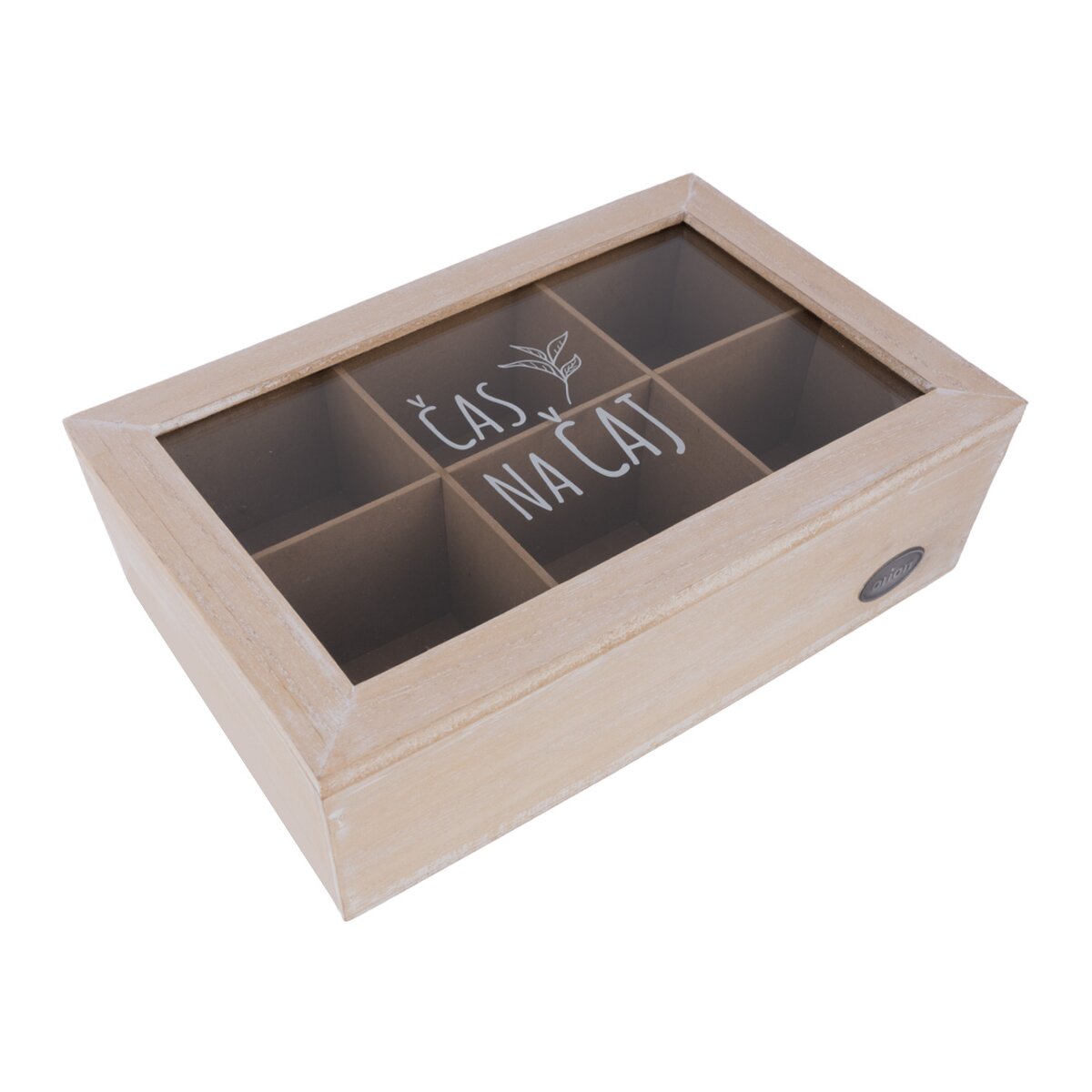 Vašim hosťom, kolegom v práci alebo klientom tak môžete štýlovo ponúknuť čaj, ktorý majú radi. Prírodne sfarbená kazeta s jemnou bielou patinou z MDF dosiek má veľkosť 24x16x7 cm a veko opatrené skleneným priehľadom s nápisom ČAS NA ČAJ. Ten vznikol v dielni našich Orion dizajnérov. Pohodlné otváranie a zatváranie zaistí kovové pánty.