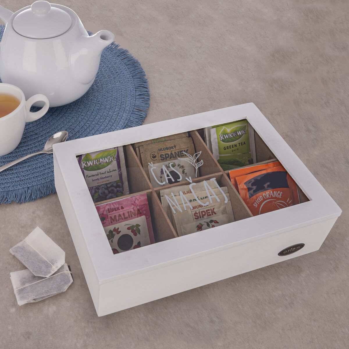 Kód produktu 154075Kazeta na čajové vrecká je praktickým a elegantným riešením pre všetkých milovníkov čaju, ktorí chcú mať svoje obľúbené čajové vrecká prehľadne usporiadané a vždy po ruke. Drevená kazeta s rozdeleným vnútorným priestorom umožňuje ľahké roztriedenie čajov podľa druhov, chutí alebo značiek. Jej čistý a nadčasový dizajn sa hodí do každej kuchyne, jedálne aj kancelárie. Priehľadné veko zaisťuje okamžitý prehľad o obsahu bez nutnosti kazetu otvárať. Materiál: drevovláknitá doska MDF, sklo, kov. Rozmery: 24x16x7 cm. Designed by Orion.