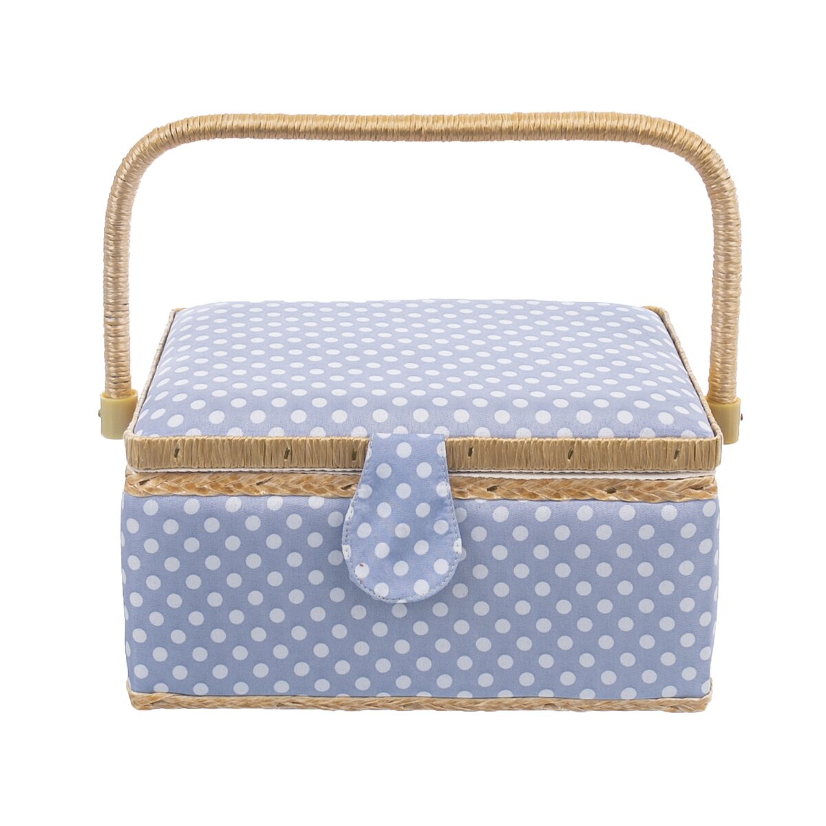 Kód produktu 154022Čalúnená modrá kazeta s bodkami veľkosti 24x18x13 cm, uzavretá vekom a držadlom na prenášanie. Je vhodná na prehľadné uloženie šijacích potrieb, vybavená ihelníčkom a plastovým odnímateľným poschodím s priehradkami