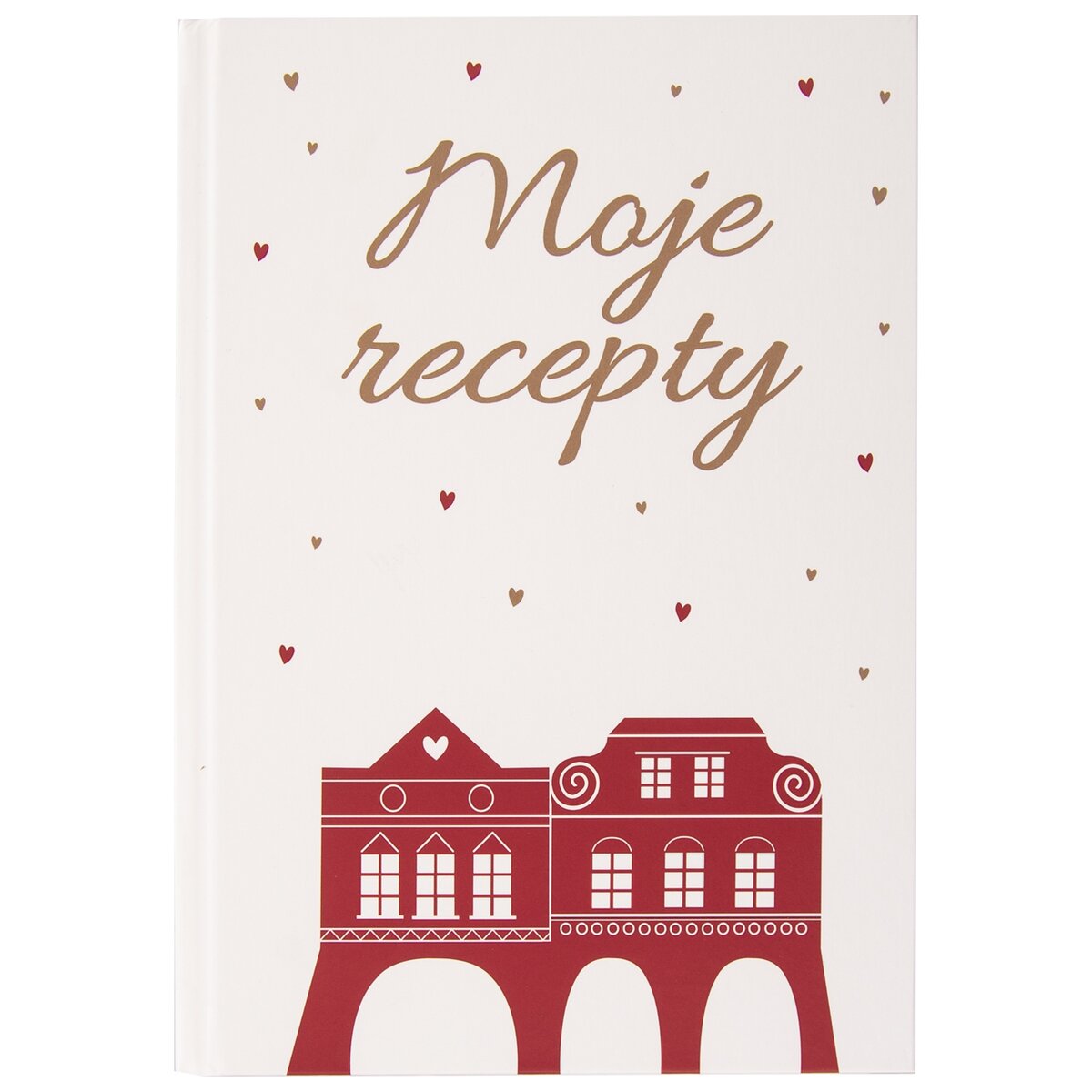 Kód produktu 741179Dizajnová kniha na recepty z kolekcie DOMKY v kombinácii svetlej farby a červeno-zlatej potlače, s rozmerom 14,5x21,5 cm. Má 180 predtlačených strán, kam si môžete zapísať zaujímavé recepty.
