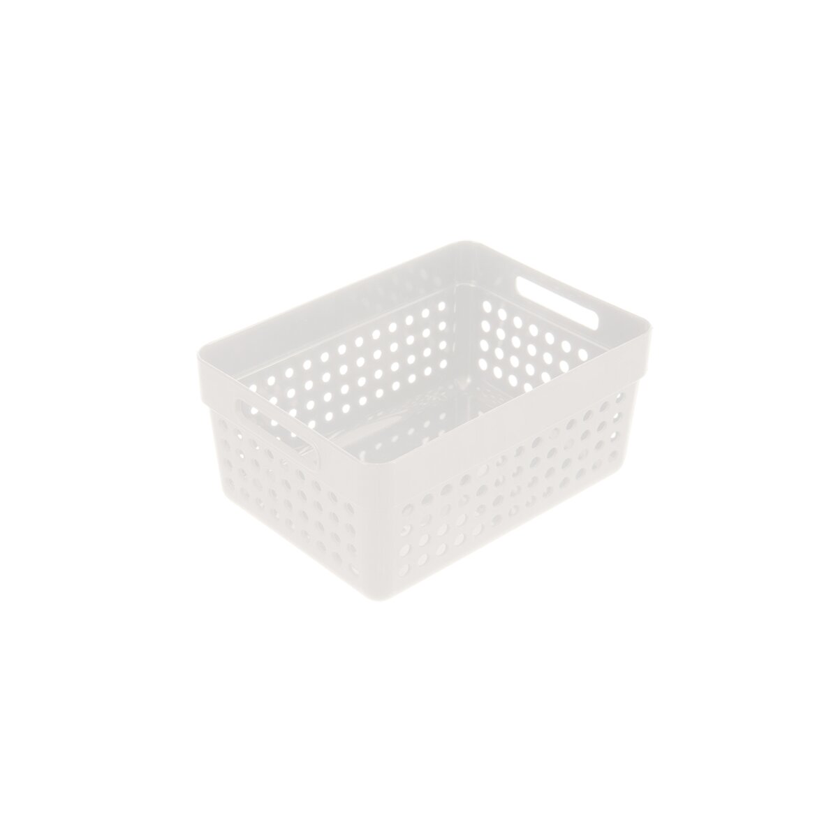 Kód produktu 731640Plastový malý košík v bielej farbe má veľkosť 15,5x11,5x7,3 cm a hodí sa na uloženie koreničiek, kancelárskych potrieb i drobnej kozmetiky.