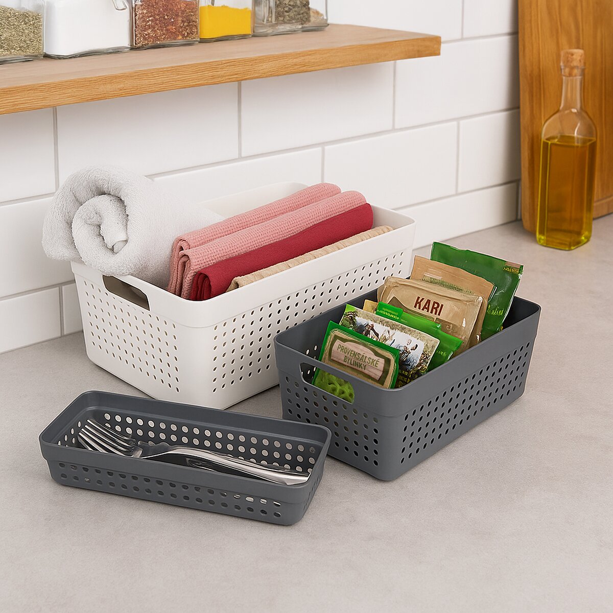 Viac informáciíPraktické košíky rôznych veľkostí sa hodia v domácnosti všade. Na pracovnej doske, v zásuvke, šatni, v potravinovej skrini aj v kancelárii pomôžu s organizáciou a poriadkom.