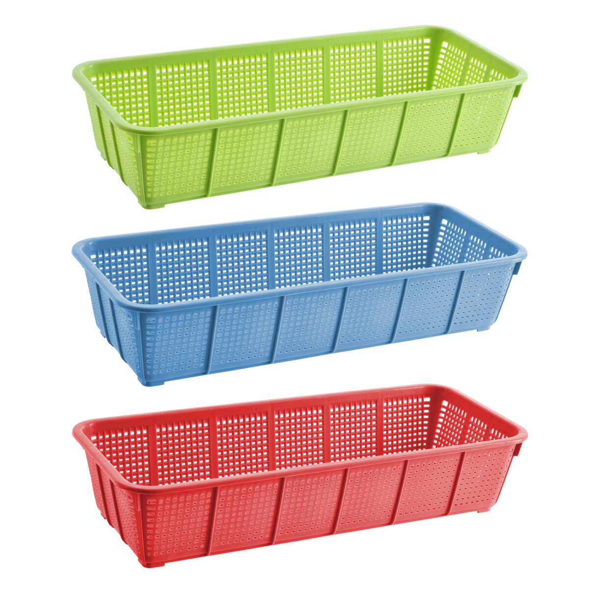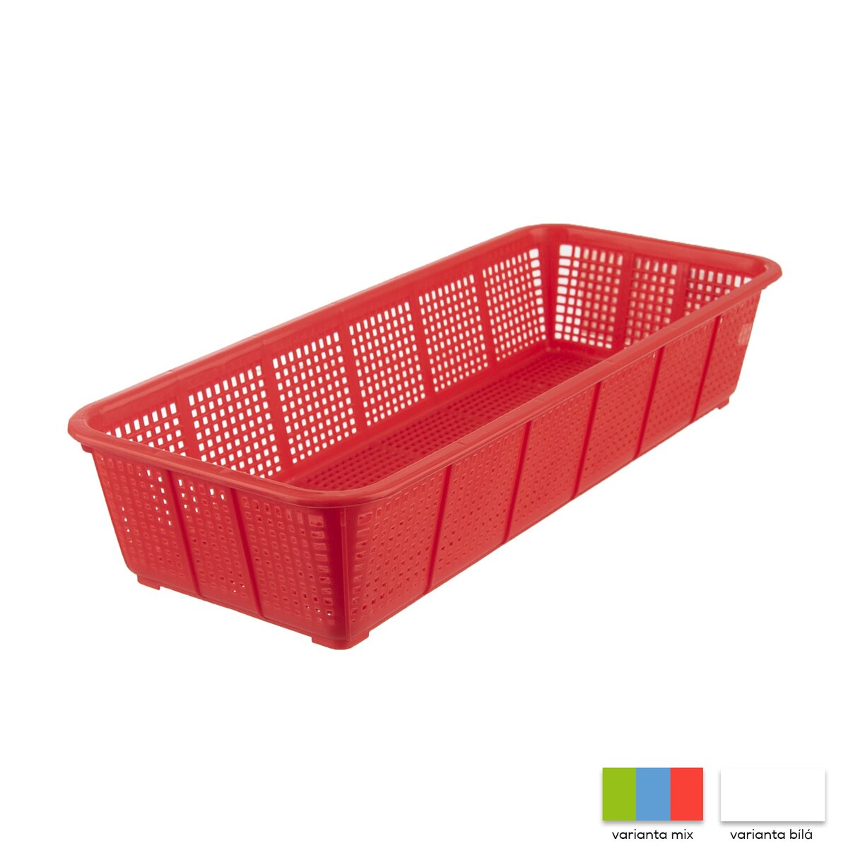Košík - organizér Vám pomôže usporiadať príbory, kuchynské náčinie, koreničky a iné drobnosti v kuchynských zásuvkách, ale môžete ho tiež využiť v zásuvkách pracovni, v detskej izbe, v dielni... Môžete kombinovať s inými veľkosťami z našej ponuky košíkov. Materiál: plast. Farebný assort. Rozmery: (šxhxv) 28x11,6x5,6 cm.