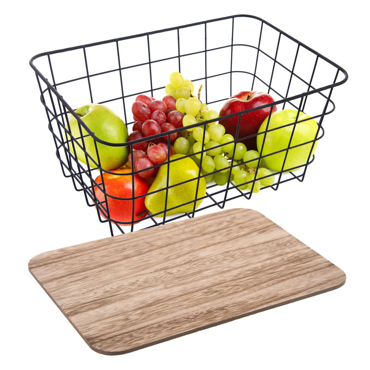 Drôtěný košík s dreveným viečkom. Materiál: kov, drevo. Rozmery: 31,5x21,5x15,5 cm.