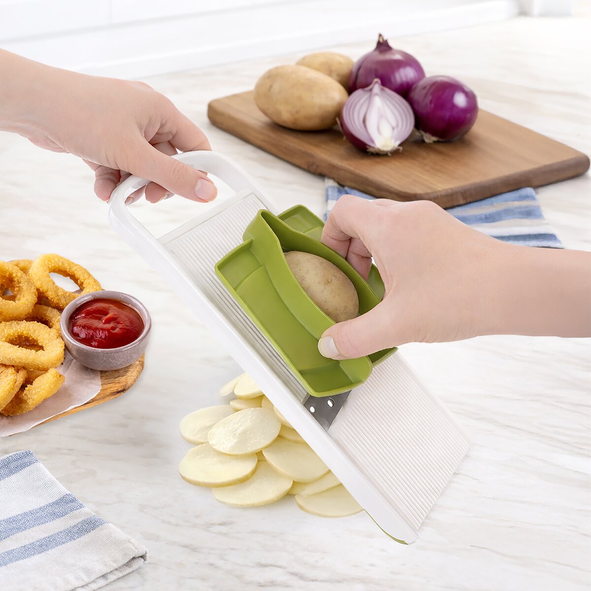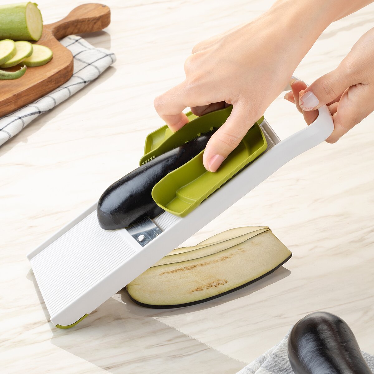 Kód produktu 144716Krájač-strúhadlo s vodiacim držiakom je praktickým pomocníkom pre rýchle a bezpečné krájanie a strúhanie potravín. Umožňuje nastavenie hrúbky plátkov v troch stupňoch – 3, 5 a 7 mm – podľa potreby a typu suroviny. Krájač je vybavený držiakom proti poraneniu so špeciálnymi hrotmi, ktoré zaisťujú pevné uchytenie potravín počas práce a umožňujú bezpečnú manipuláciu aj s malými surovinami, napríklad cesnakom. Pre väčšiu stabilitu pri použití obsahuje prístroj dva protišmykové rohy, ktoré zabraňujú nežiaducemu posunu krájača počas krájania či strúhania, a zaisťujú tak pohodlnú a bezpečnú prácu v kuchyni. Výrobok je BPA-free. Materiál: plast ABS + plast PP (držiak) + nerezová oceľ 301 + EVA (anti slip rohy). Rozmery: 28x10,5x4 cm. Možno umývať v umývačke.