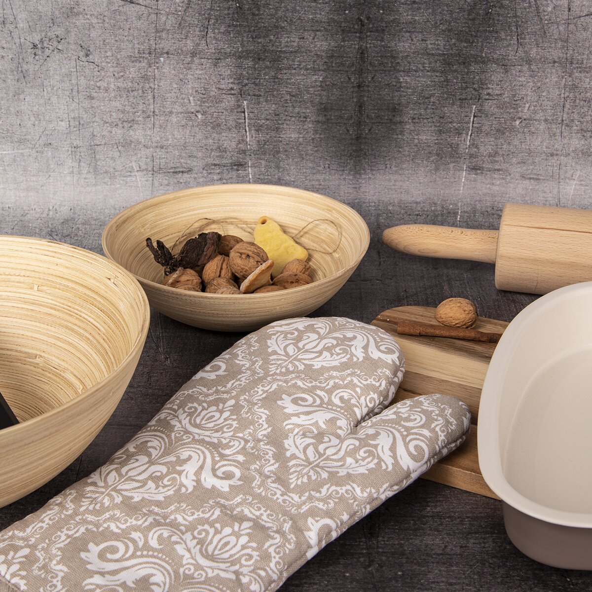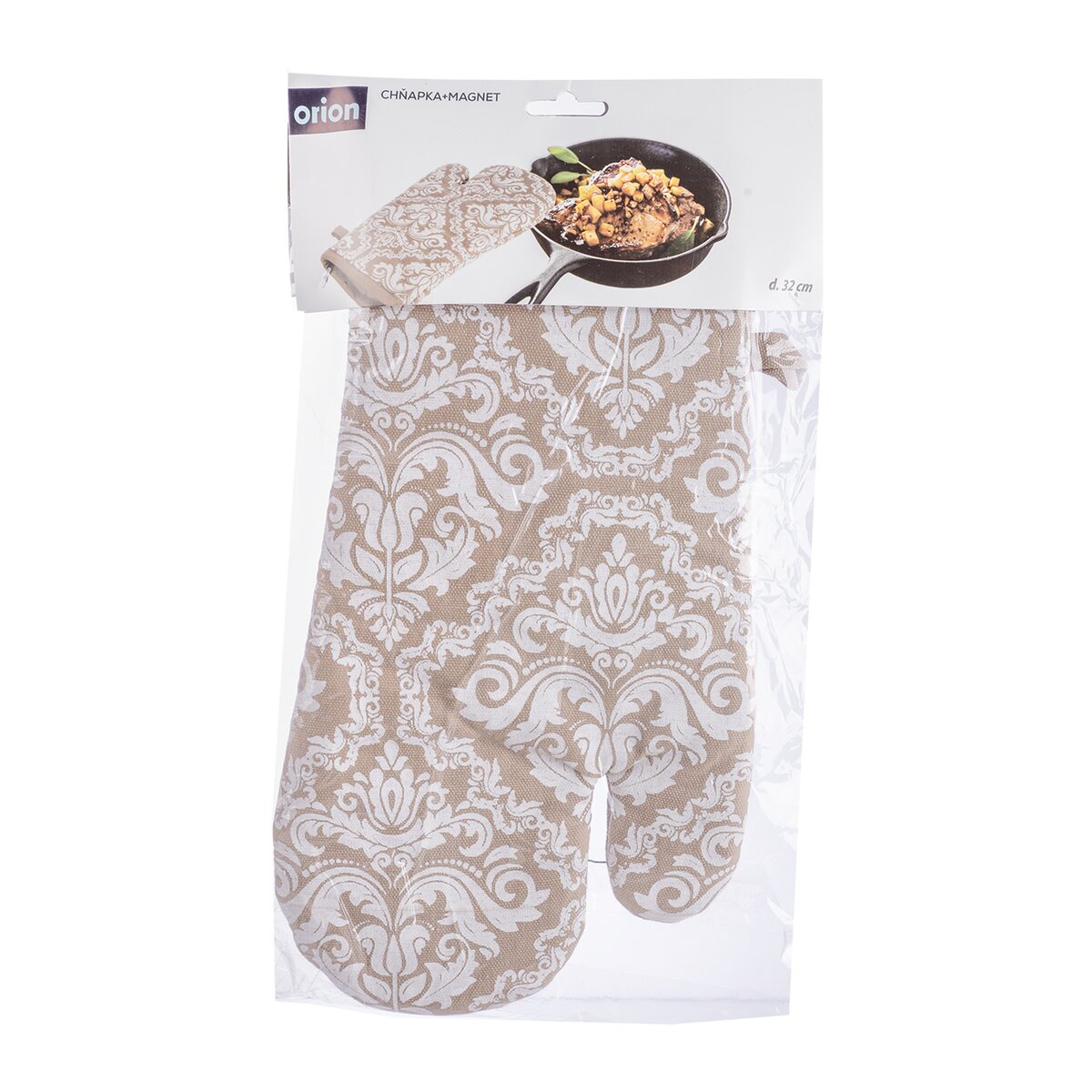 Viac informáciíAj chňapka môže byť štýlová. To potvrdzuje táto bavlnená kuchynská rukavica, ktorá je štýlovým a funkčným doplnkom do vašej kuchyne. Zdobia ju ornamentálne úponky na béžovom podklade.