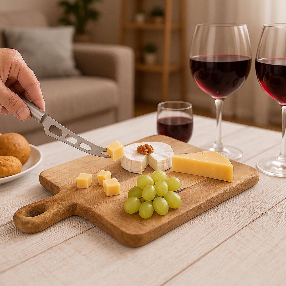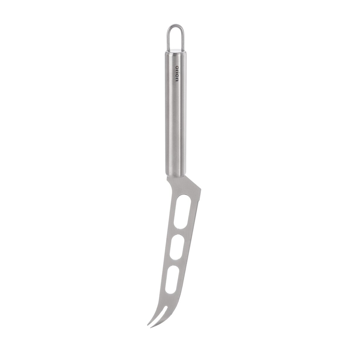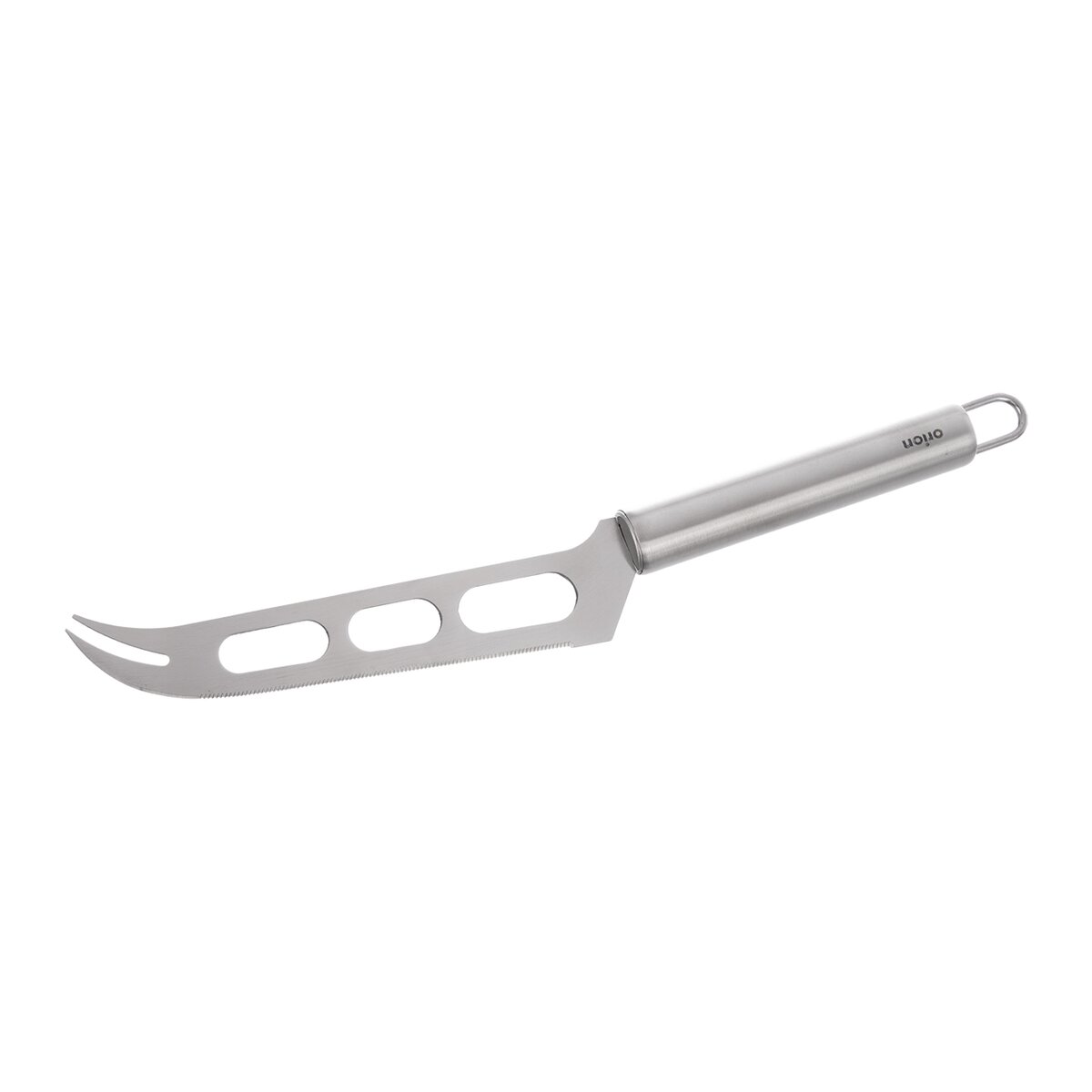 Kód produktu 842406Nerezový nôž na mäkké a polomäkké syry z kolekcie KITCH je ideálny na ľahké krájanie syrov, ktoré sa pri použití bežného noža často lepia alebo stláčajú – napríklad camembertu, brie, hermelínu, gorgonzoly či mladých plesňových a polotvrdých syrov. Vďaka tenkej úzkej čepeli s vrúbkami s pozdĺžnymi otvormi sa minimalizuje trenie a zabraňuje priľnavosti, takže plátky zostávajú čisté a úhľadné. Na špičke je praktická vidlička, s ktorou je možné nakrájaný kúsok ľahko nabrať a rovno naservírovať. Nôž nájde svoje uplatnenie ako v domácej, tak aj v profesionálnej kuchyni. Rukoväť je opatrená očkom pre ľahké zavesenie. Nie je vhodný do umývačky riadu. Materiál: nerezová oceľ. Rozmery: celková dĺ. 26,3 cm, dĺ. čepele 14,2 cm, š. čepele 2,5 cm.