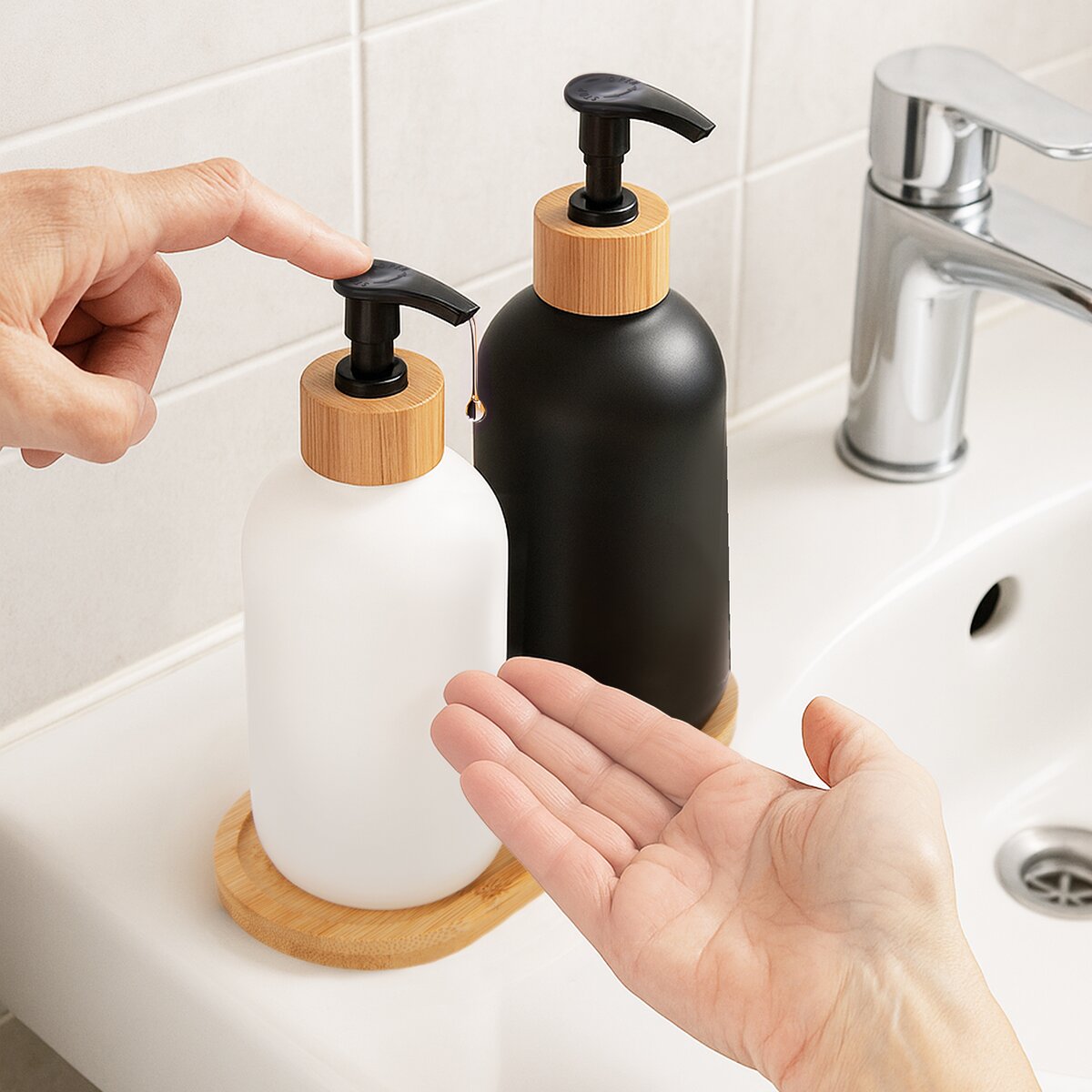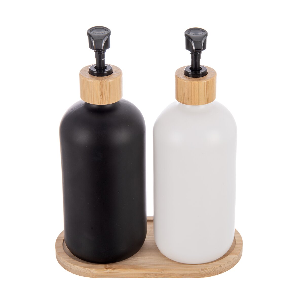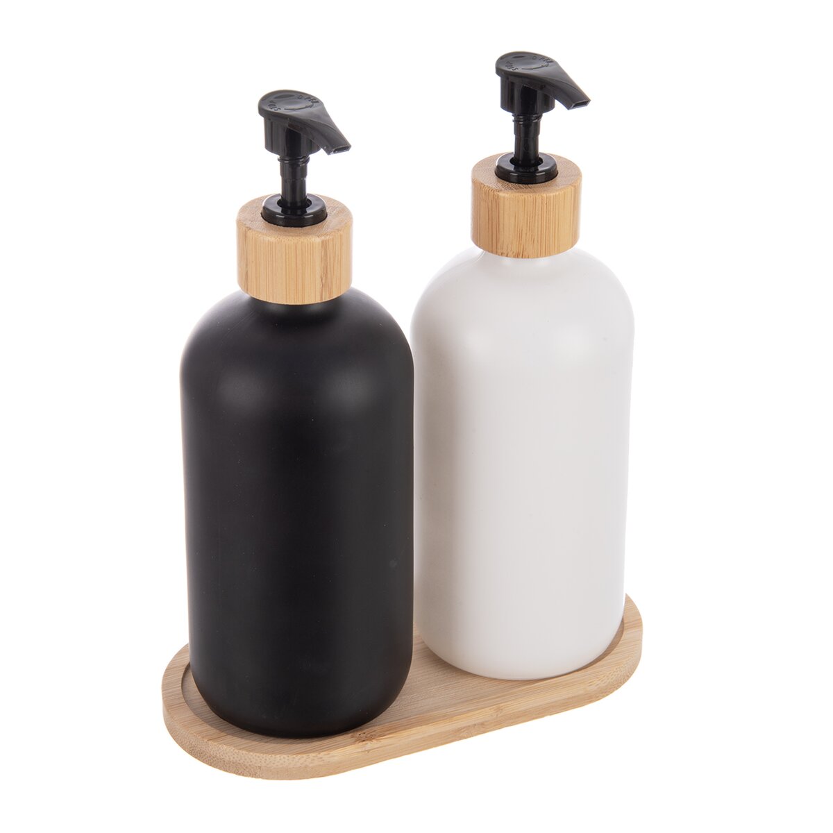 Kód produktu 531349Kúpeľňová súprava dvoch dávkovačov na štýlovej bambusovej tácke oživí každú kúpeľňu aj kuchyňu. Jej moderný a zároveň prírodný vzhľad pôsobí veľmi elegantne a vkusne zapadne do rôznych interiérov. Dávkovače si navyše môžete ľubovoľne označiť pomocou našich nálepiek, čo zaistí prehľadnosť a praktickosť pri každodennom používaní. Táto sada je ideálnou kombináciou estetiky a funkčnosti. Materiál: sklo, bambus (tácka), plast PP (pumpička). Rozmery: 17,5x9x22 cm, dávkovač pr. 7,5 cm, v. 21 cm, o. 500 ml.