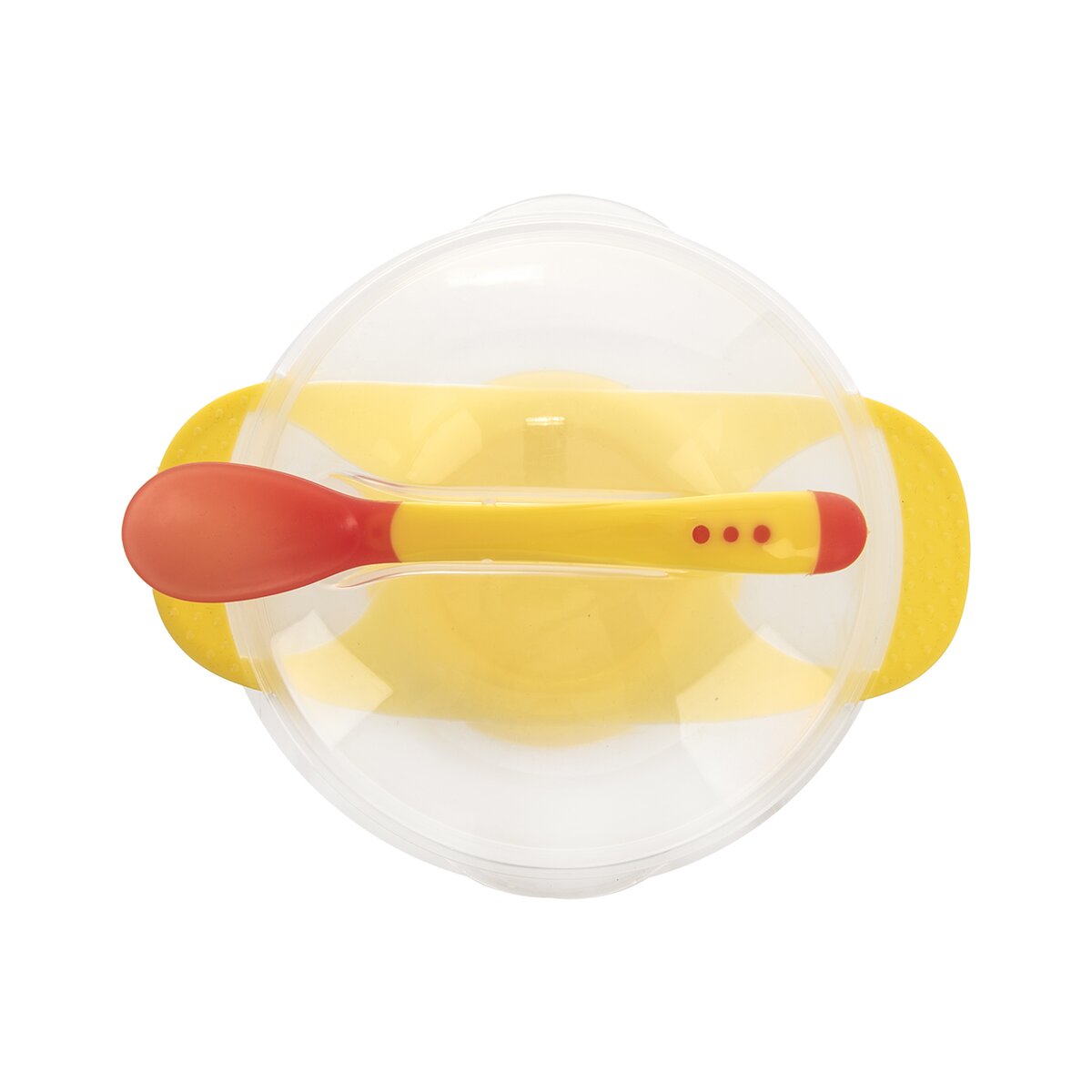 Kód produktu 129804Detská miska s viečkom, lyžičkou a s prísavkou na desiaty, vyrobená z transparentného plastu so žltými prvkami, bez obsahu BPA. Je doplnená dvomi uchami, viečkom, lyžičkou a v spodnej časti opatrená gumovou prísavkou.