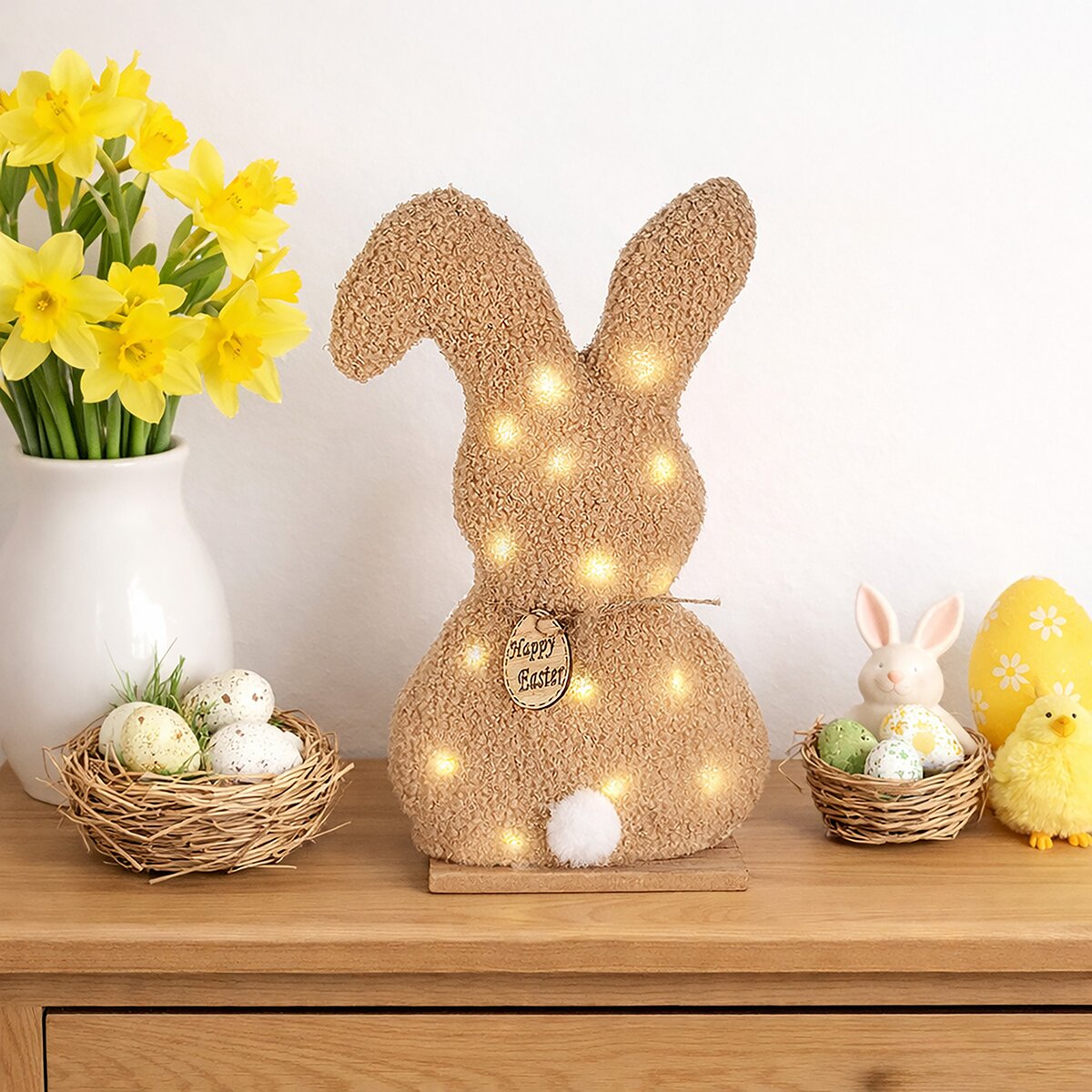 Okrem kuchynských pomocníkov nechýba ani dekorácia s jemnou jarnou a veľkonočnou tematikou. Dekorácia z mangového dreva v podobe zajačikov krásne doplní sviatočne prestretý stôl alebo okenný parapet. Jemné farby a prírodný vzhľad zapadnú do moderných aj rustikálnych interiérov.