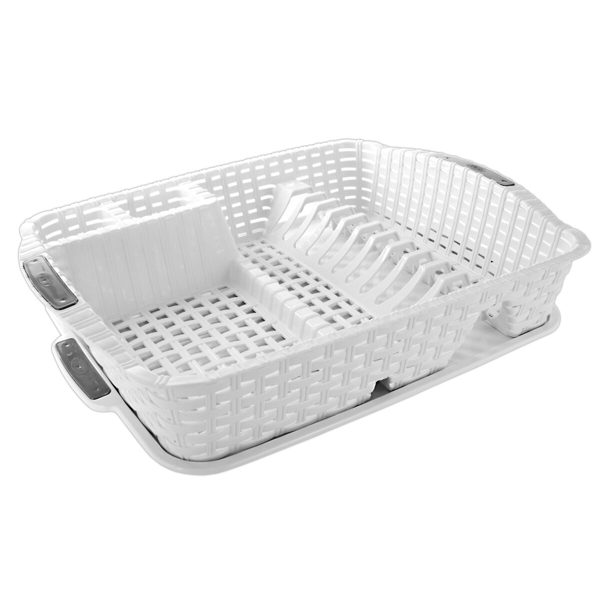 Kód produktu 150674Odkvapkávač na riad s podnosom. Členený - sekcie na príbory, taniere a na ostatný riad. Materiál: plast. Dekór ratanu. farba biela. Rozmery: 48x38x10 cm.