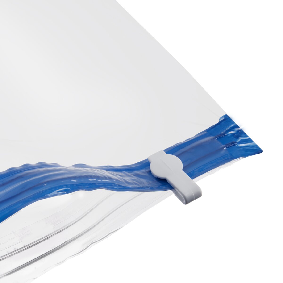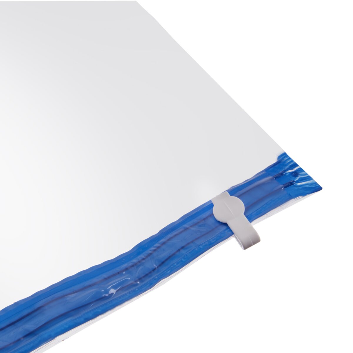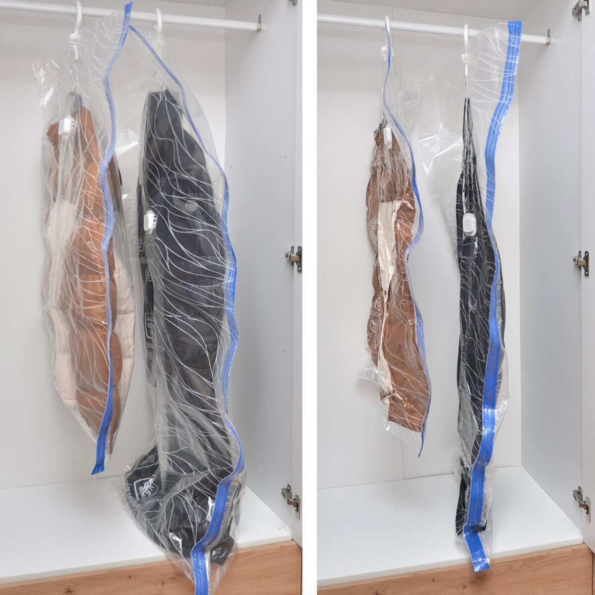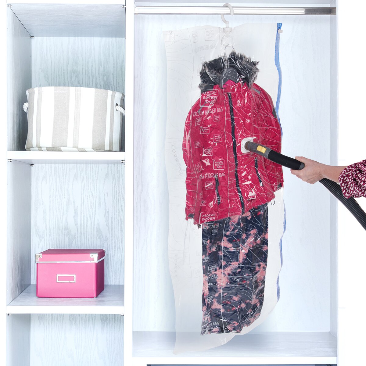 A ako na to? Oblečenie vložíte na ramienku do vaku (buď položeného na zemi alebo rovno zaveseného na šatníkovej tyči), uzavrite modrý lem, otvorte kryt ventilu, vysávačom odsajete vzduch, zacvaknete ventil a je hotovo. Po odsatí vzduchu z vaku sa objem vaku výrazne zmenší (až o 75 %) a Vy ušetríte miesto na ukladanie. Odevy zároveň chránite pred vlhkom, roztočmi, moľami aj prachom.